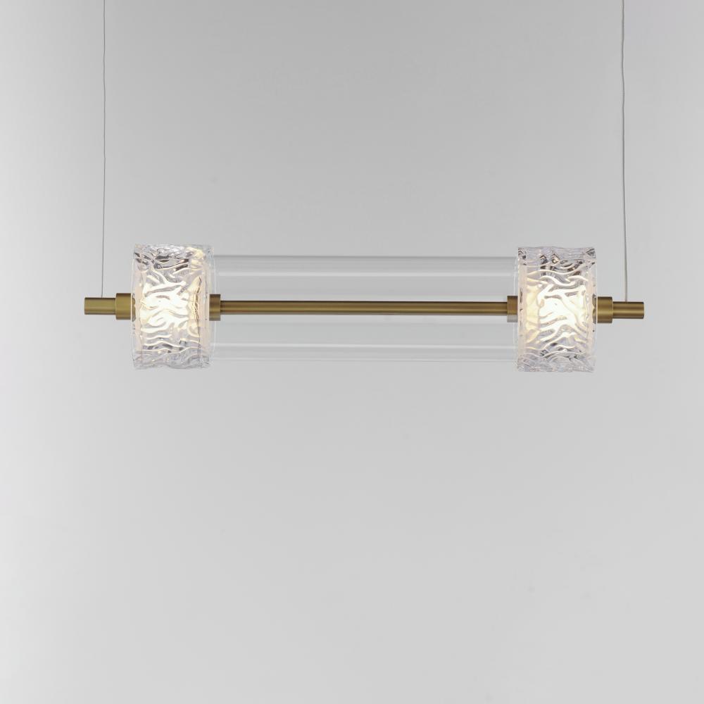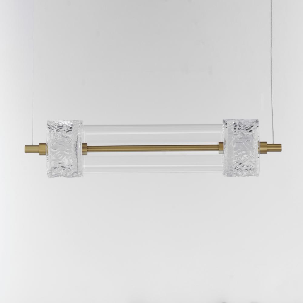 Segments of Clear glass cylinders are separated by distinctly rippled Clear crystal fonts on a thin Natural Aged Brass frame. The translucent segments are backlit with integrated LED illumination creating an airy, ethereal composition of glass textures. Av