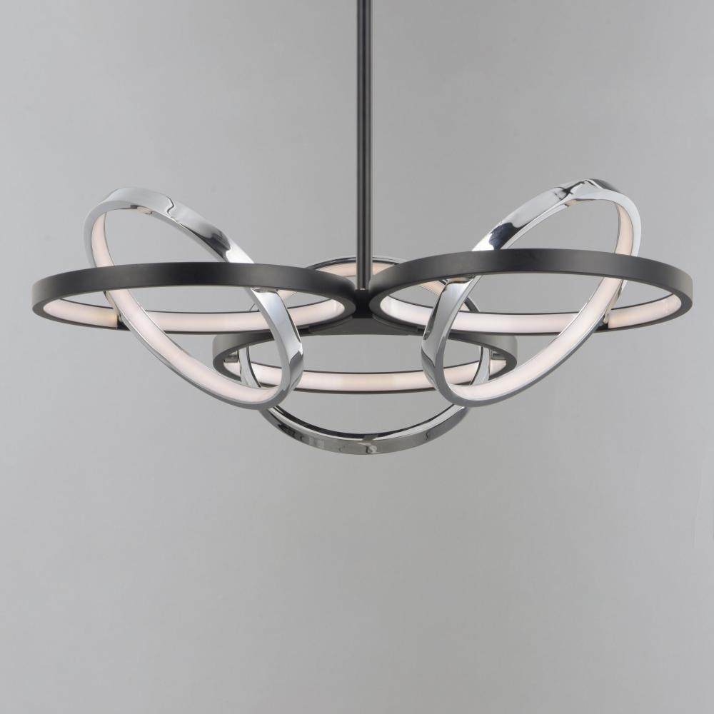 A very unique and interesting design that features concentric bands of Polished Chrome or Black that rotate on 3 axis points and adjusts in multiple directions similar to a gyro. The edge of each slender band encases a small LED strip covered by a frosted