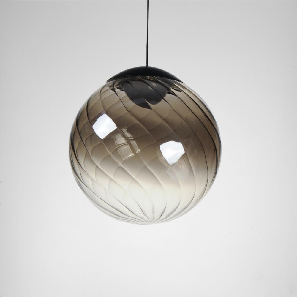 In a galaxy of light, ribbed and tinted glass is supported by swooping arcs of circular tubes. The Gold frame supports glass globe shades colored in Amber and Smoke tints that encase LED lamps provided. The single pendant has an over-sized spiraling glass