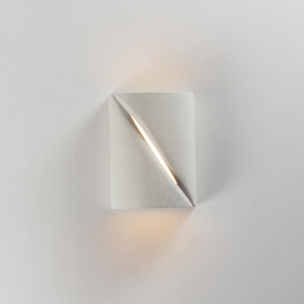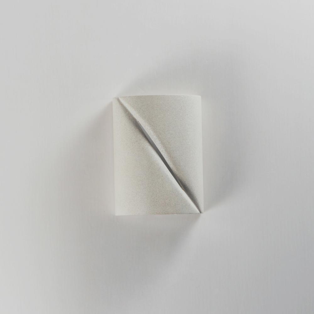 Softly rounding forms are constructed of outdoor-rated concrete molds. Finished in Greystone or Chalky White, these sconces are both playful and sophisticated. A diagonal reveal along the fixture's body emits light while also casting light above and be