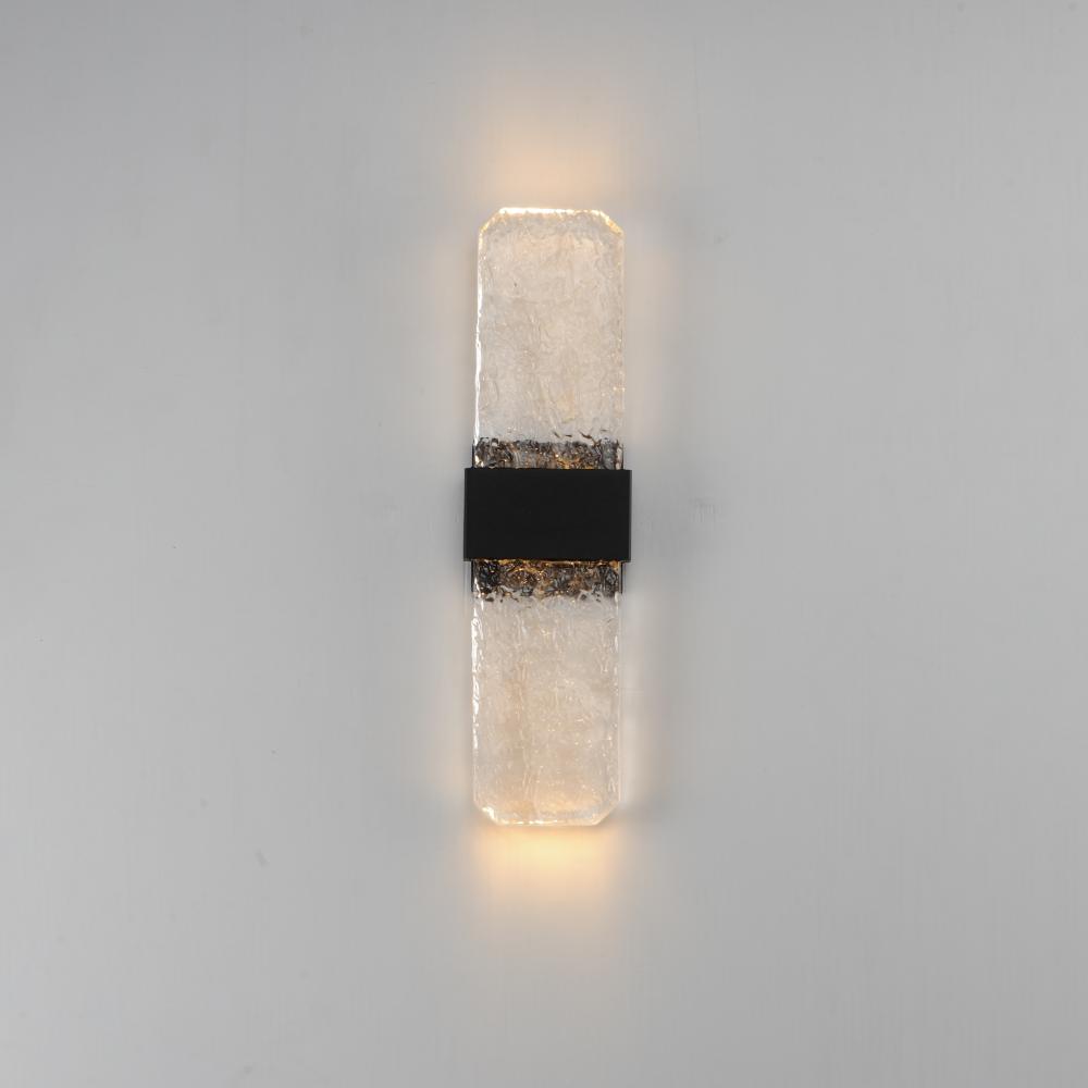 Artisanal cast glass slabs are supported by a Die Cast Aluminum bracket finished in an outdoor rated Black powder coat. Emphasizing the unique beauty of the glasses' imperfect contours, the sconces accentuate these features with concealed LED lighting.