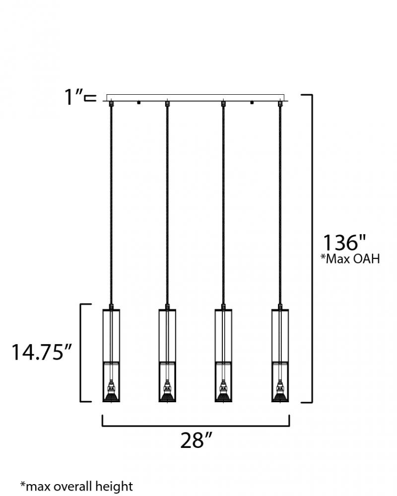 Machined Aluminum tubes of Black, Polished Chrome, or Brass suspend within clear glass overlays. An LED GU10 bulb is recessed within the metal tube providing great directional lighting. Available as a single pendant or as a 4-Light linear pendant.