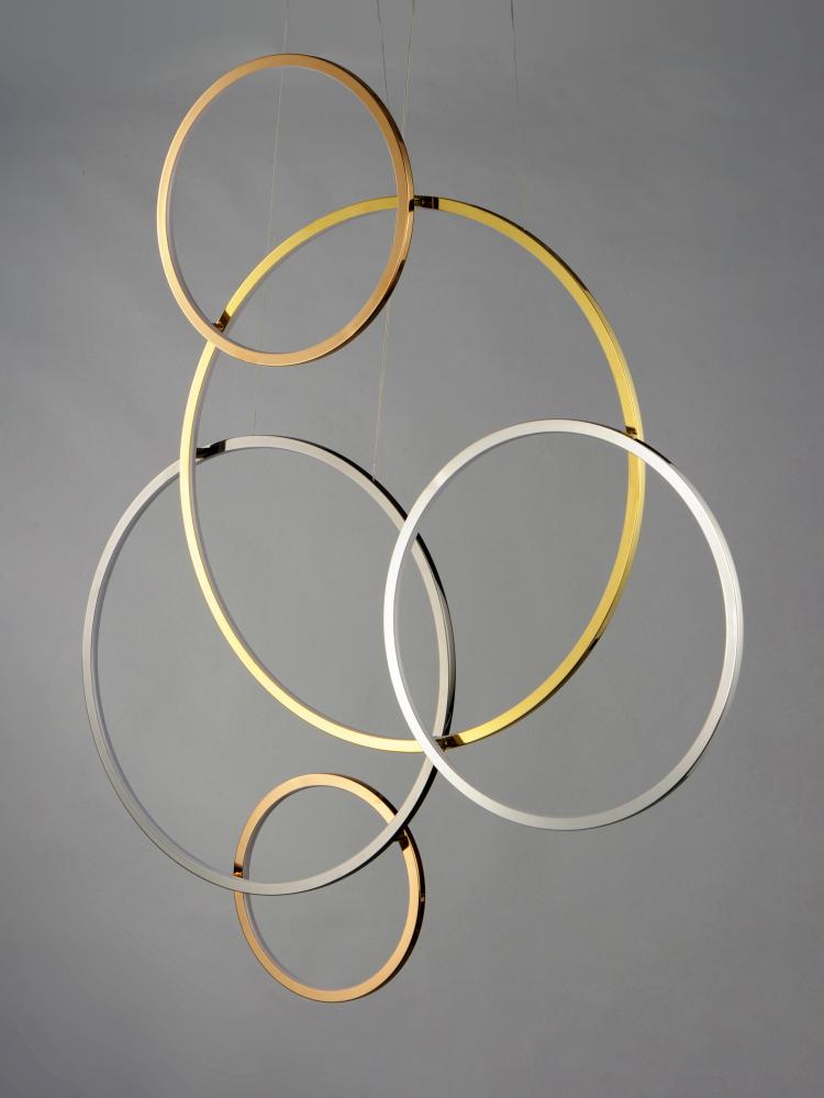 Intersecting rings for this large scale sculpture available in either vertical or horizontal configurations. Multiple high end finishes were used to blend in with today's eclectic interiors. The perfect fixture to fill a large space, this can also be