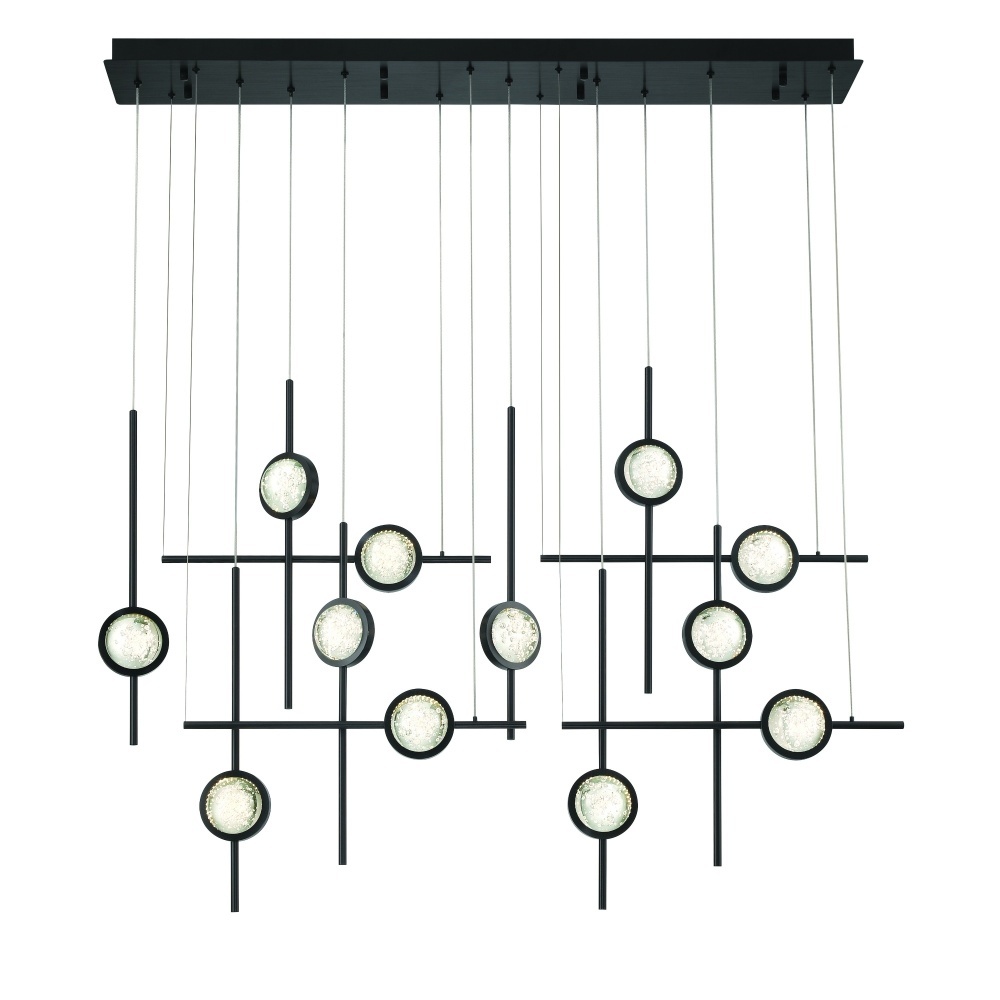Various sized anodized rods suspend vertically in black or gold finishes. Each rod is furnished with a clear seeded glass orb that perfectly sits within an anodized ring.