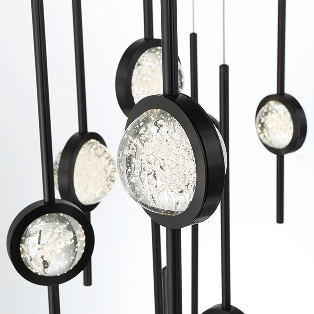 Various sized anodized rods suspend vertically in black or gold finishes. Each rod is furnished with a clear seeded glass orb that perfectly sits within an anodized ring.