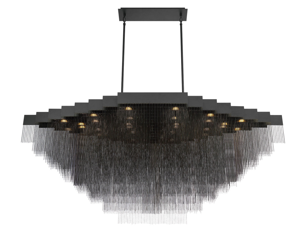 A lustrous collection of delicate, high-gloss metal chains cascade like gleaming streams of water in this transitional piece. Resembling armored chain mail, the polished, plated mesh envelops each integrated LED light to add a soft, shimmering glow.