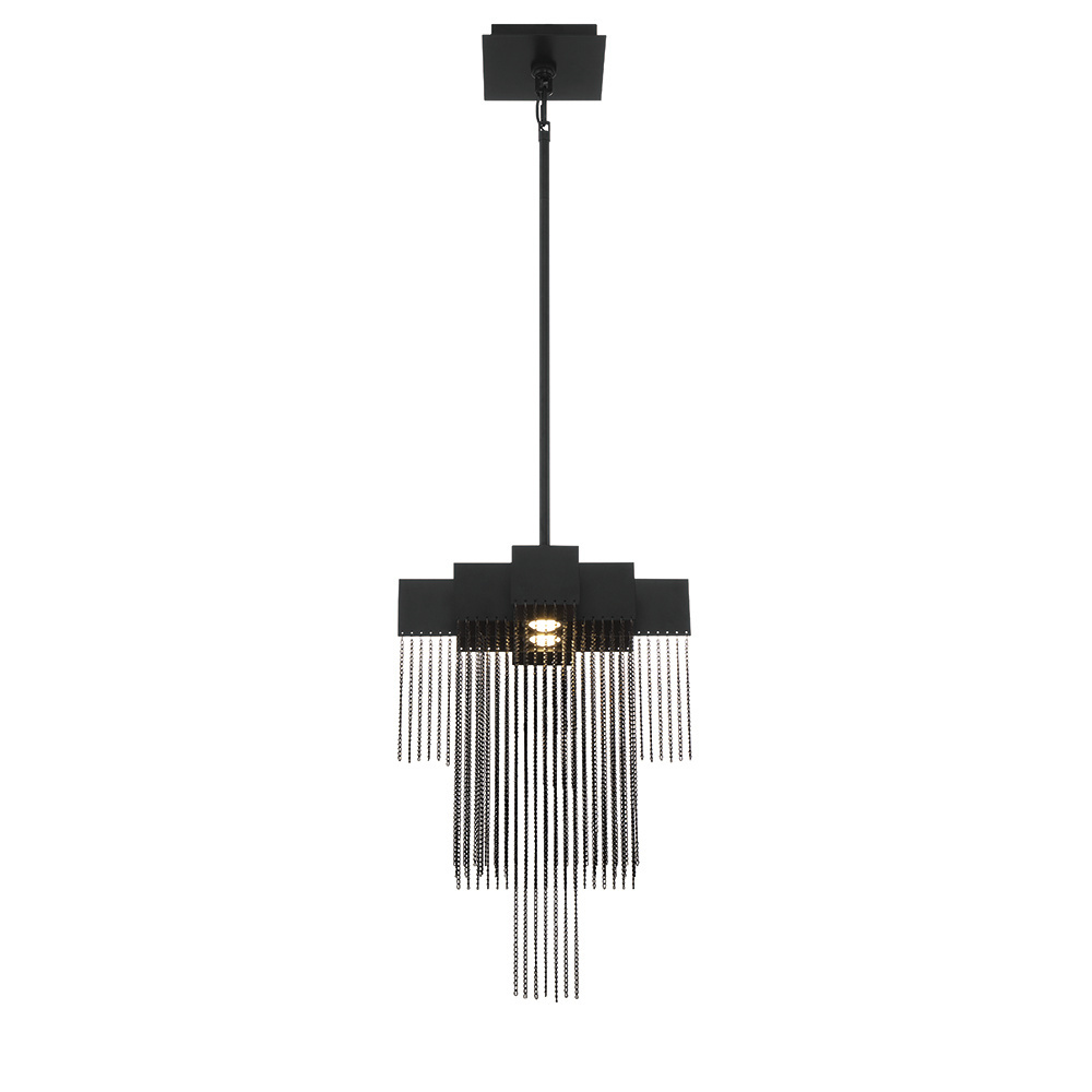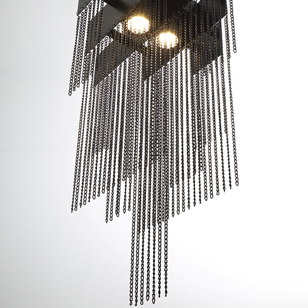 A lustrous collection of delicate, high-gloss metal chains cascade like gleaming streams of water in this transitional piece. Resembling armored chain mail, the polished, plated mesh envelops each integrated LED light to add a soft, shimmering glow.