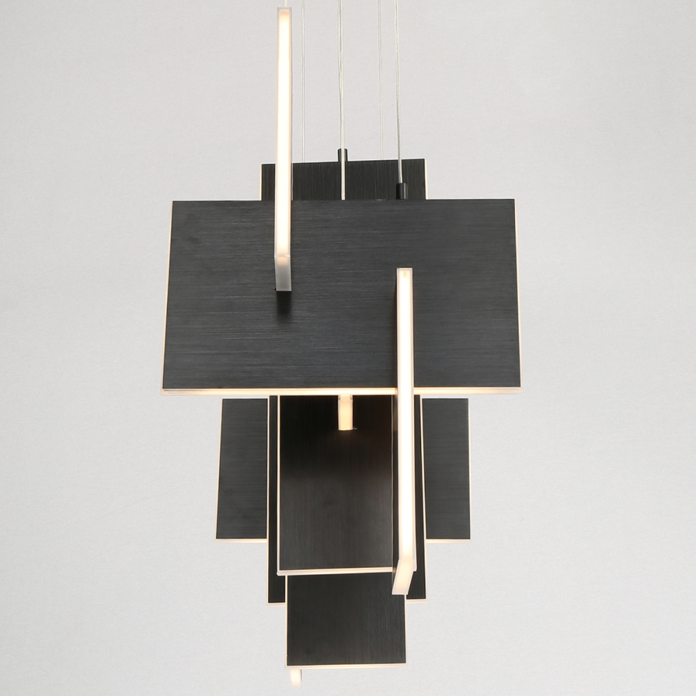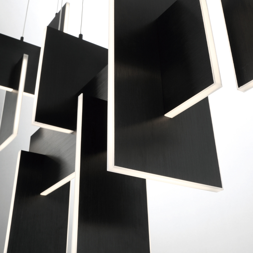 Slim, edge-lit LED panels are creatively positioned to intersect in a dynamic, whimsically modern design. A continuous run of LED lights delivers seamless, multi-directional lighting. The interlocking aluminum panels are laser cut for added precision and anodized to create a durable, corrosion-resistant finish that’s available in either gold or black.