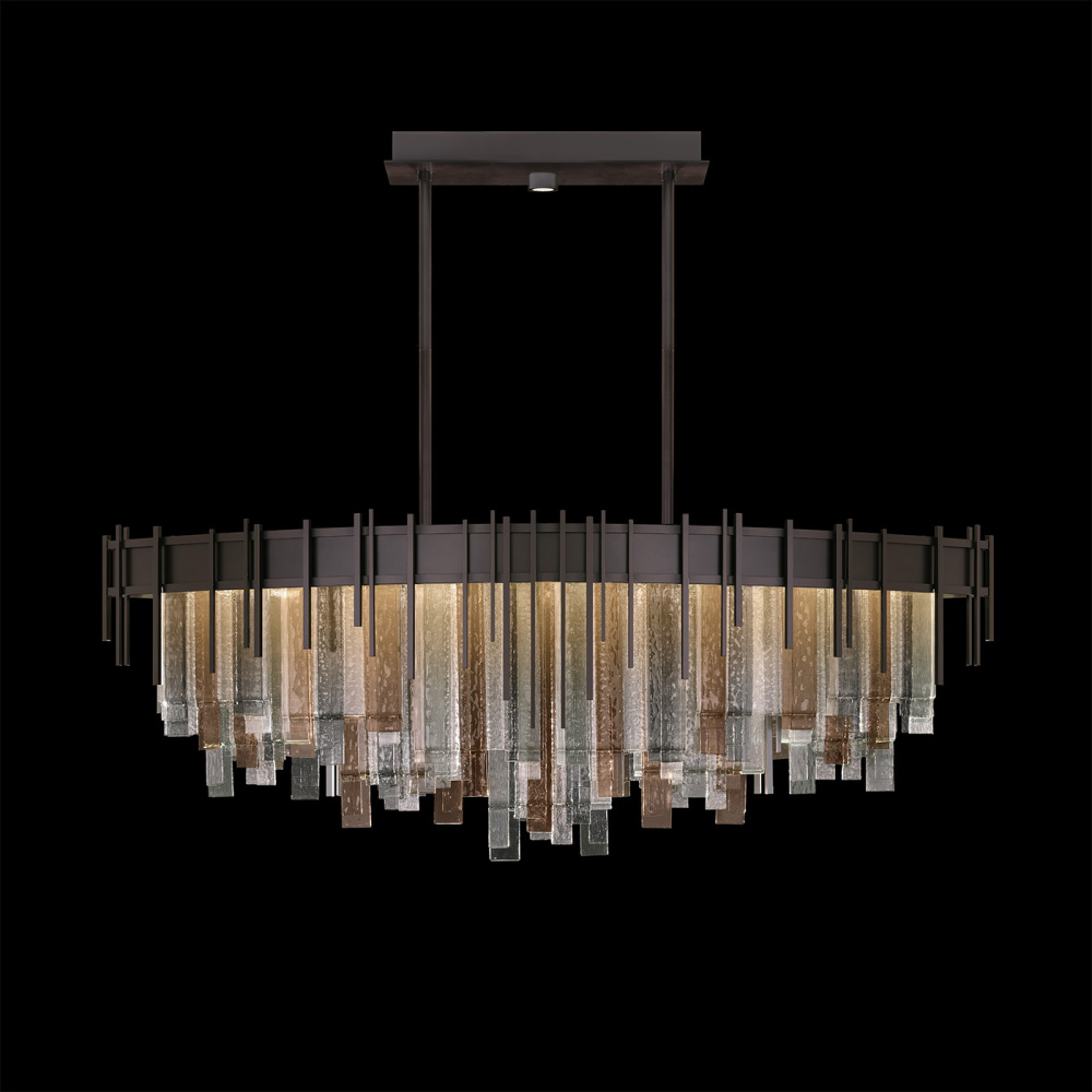 Inspired by the love of Jazz and the harmonious arrangement of musical notes, this Arpeggio pendant features panels of cascading glass fused together to create a chorus of visual delight.The collection emulates melody and movement, characterized by its multi-layered design of fused-glass panels, combining clear and colored glass to create a captivating, textured look.Color glass options feature textured glass panels masterfully layered and fused together in clear, or multi-tonal mix of clear, smoke, and bronze, with Midnight Steel or Soft Gold Leaf finish options.