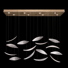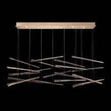 Elevate raises your environment to new heights. Each Crystal Stardust glass spire is hand sculpted with translucent clear crystal and surrounded by a clear crystal casing. Illuminated from a soft gold leaf canopy and suspended by adjustable cables, this Made in America rectangular fixture features 20 sculpted spires and is ideal for low ceilings. Shown in a “horizontal” design.