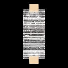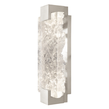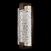 Indoor/outdoor aluminum sconce features a three-dimensional contrast of deep textured and polished cast glass. This stunning landscape of the glass, illuminated by waterproof LEDs, is available in clear (shown) or highlighted with antiqued gold leaf. Choice of three finishes, champagne tinted gold leaf finish or silver leaf for indoor only, and a hand rubbed black iron for indoor and outdoor use.