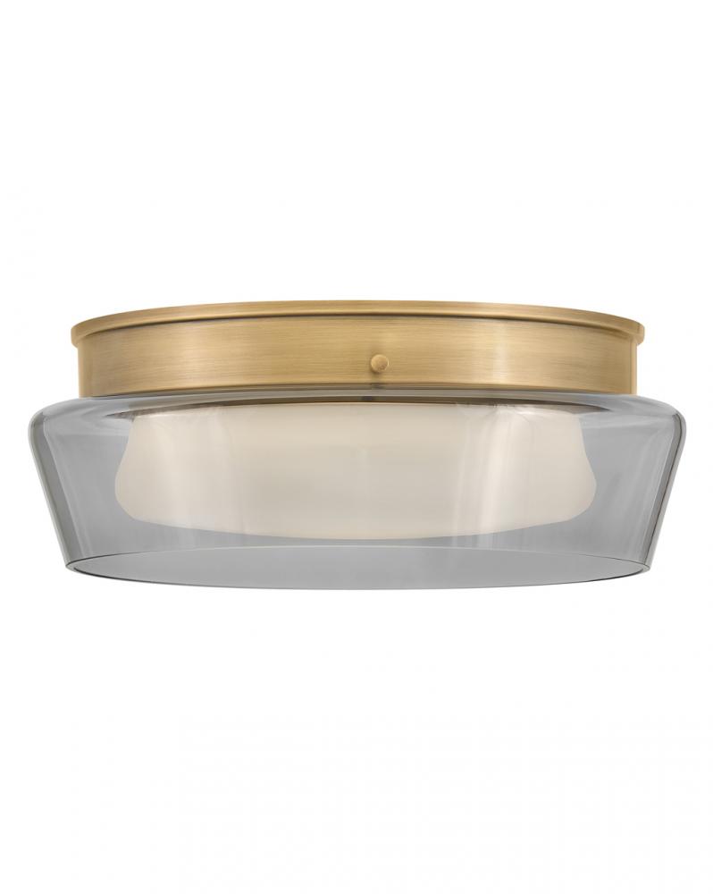 Sleek with a modern, low-profile silhouette, Demi’s thick, smoked glass shade surrounds cased opal glass, creating a sophisticated effect as light diffuses from dimmable integrated LEDs. A robust canopy complements the glass with a Heritage Brass or Black Oxide finish.