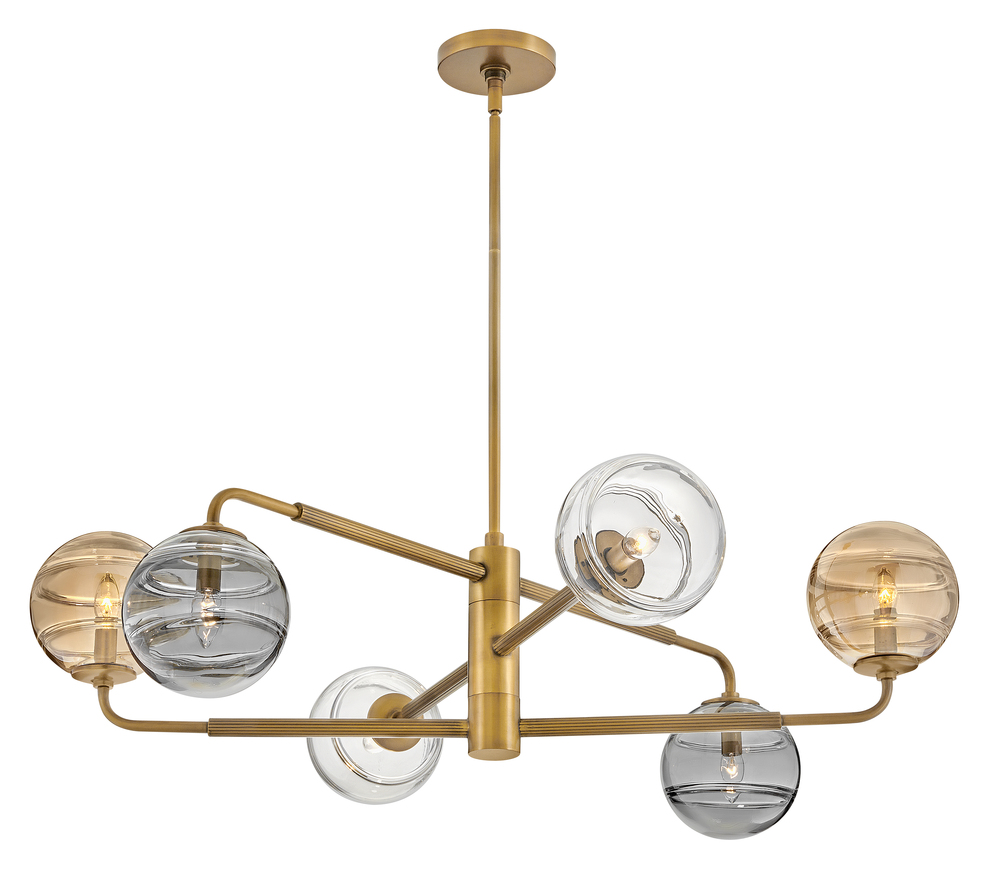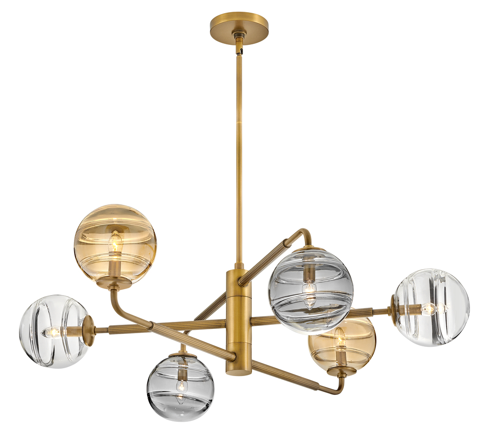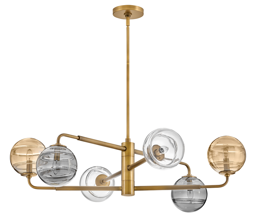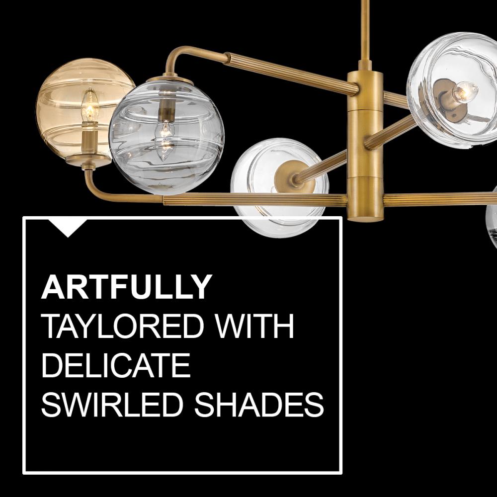 Artfully combining unexpected materials and innovative technology, Oberon's ribbed stems and articulating arms in Heritage Brass allow for a tailored, transitional silhouette. Delicate swirls detail spherical shades in amber, clear, and smoke glass.