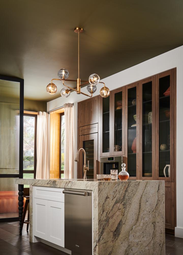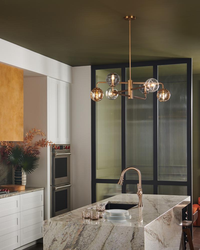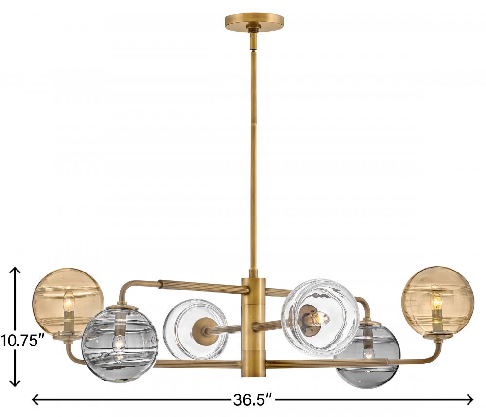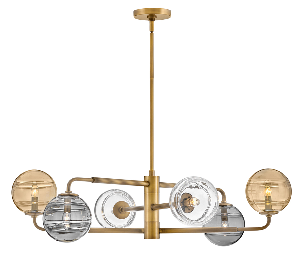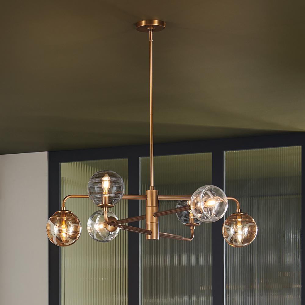 Artfully combining unexpected materials and innovative technology, Oberon's ribbed stems and articulating arms in Heritage Brass allow for a tailored, transitional silhouette. Delicate swirls detail spherical shades in amber, clear, and smoke glass.