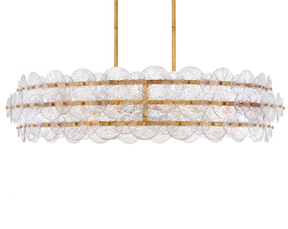 Rene radiates light through multiple layers of beautiful, pressed glass disks. Rene’s signature touch highlights a Distressed Brass finish, evoking both transitional and glam influences.