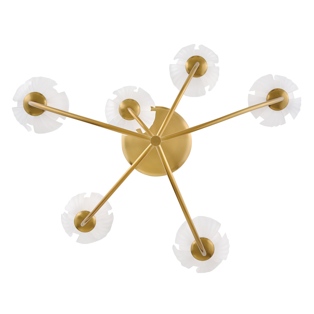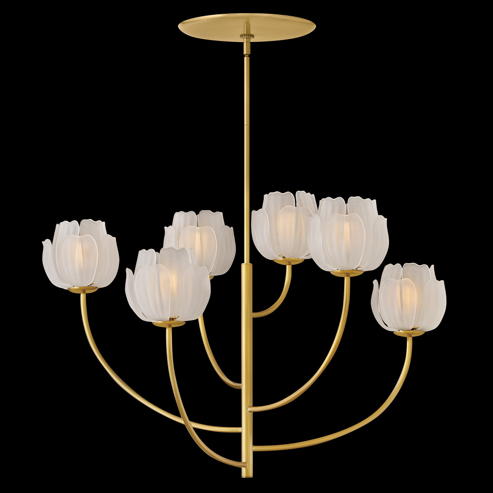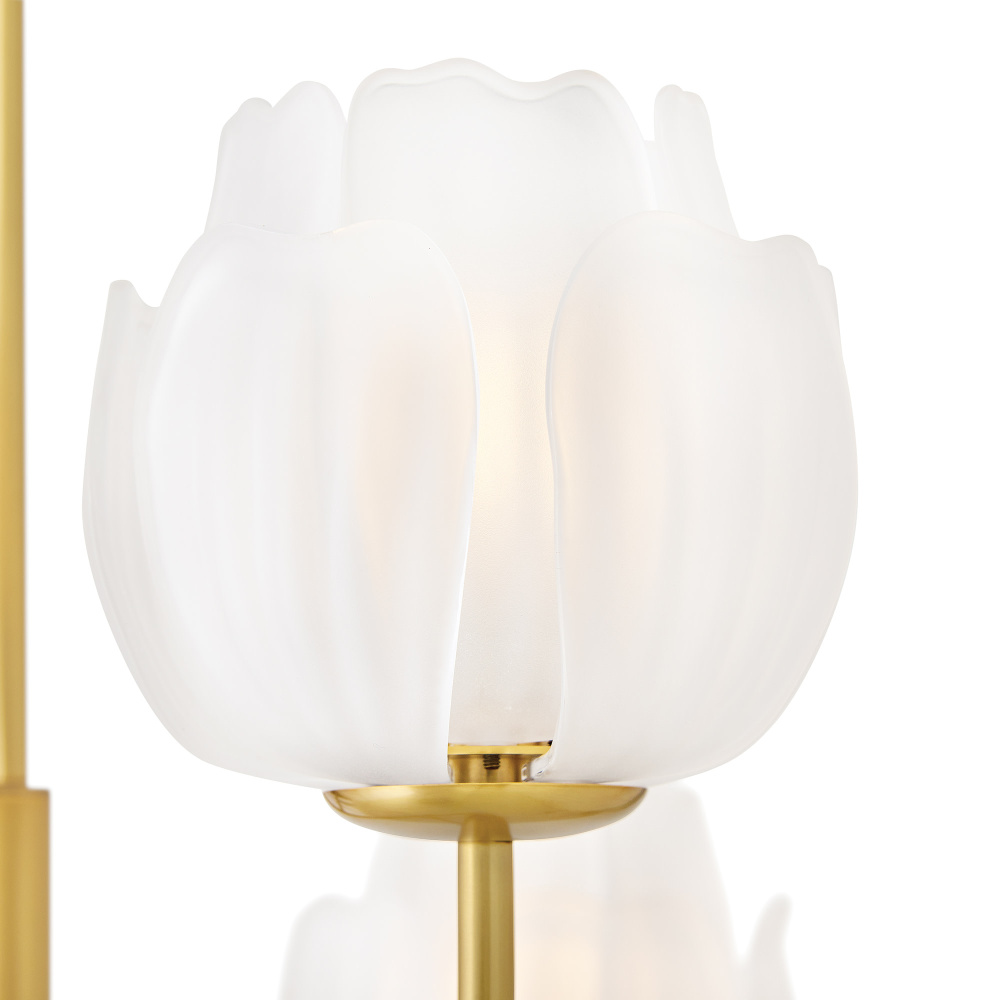 Fantine’s flowing blooms are inspired by preserved flowers suspended in time. Uniquely shaped artisan-sculpted glass arranged in lush layers creates an ethereal dance of light and shadow. An exaggerated canopy and slender stems are crafted from solid brass in a hand-touched Unlacquered Brass finish.