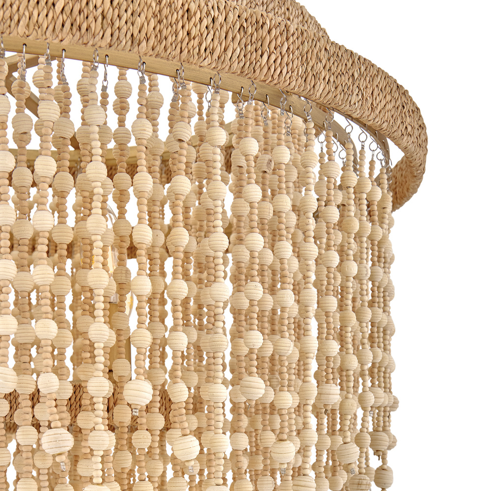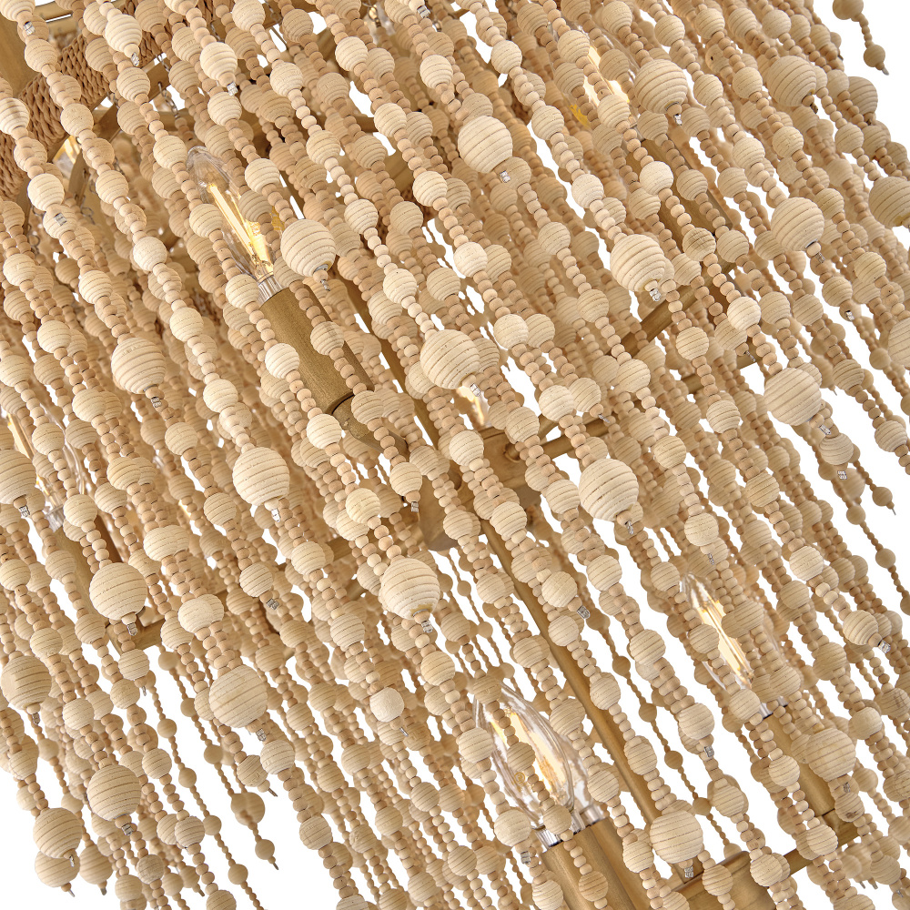Juxtaposing unconventional materials and naturally inspired detailing with the timelessness of traditional tiered chandeliers, Freya’s cascading shade is draped with intricate beadwork. Individual strands of wooden beads are hung from hand-painted Burnished Gold frames to form bohemian curtains that cast beautiful shadows from warm candelabra lamps.