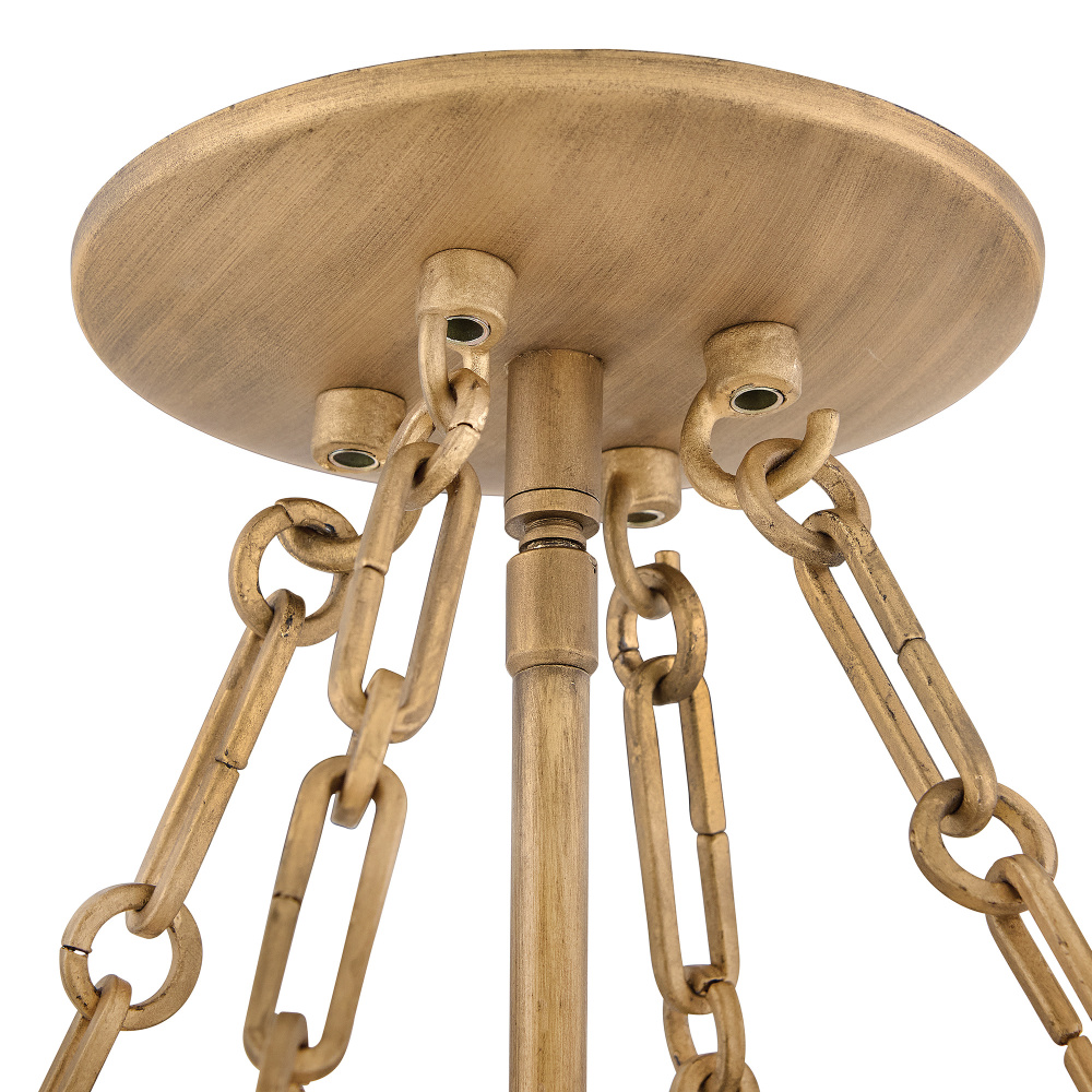 Deftly slumped and artfully arranged sheets of swirled glass appear to unfurl from Fleur’s beautiful drum silhouette, complemented by a central band hand-painted in Burnished Gold. White, cloud-like layers softly diffuse inviting illumination from warm candelabra lamps, creating an enchanting atmosphere.