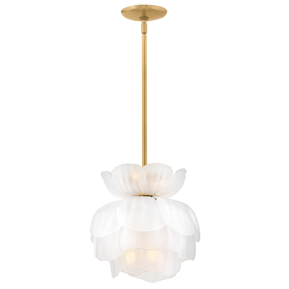 Fantine’s flowing blooms are inspired by preserved flowers suspended in time. Uniquely shaped artisan-sculpted glass arranged in lush layers creates an ethereal dance of light and shadow. An exaggerated canopy and slender stems are crafted from solid brass in a hand-touched Unlacquered Brass finish.
