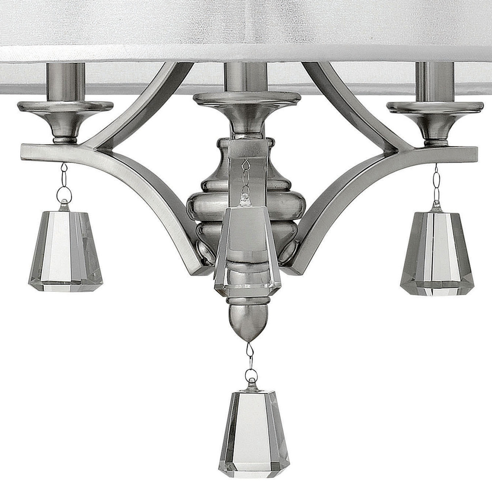 This elegant collection in our Brushed Nickel and French Bronze finish features a sheer translucent double hardback shade and tapered square crystal accents.