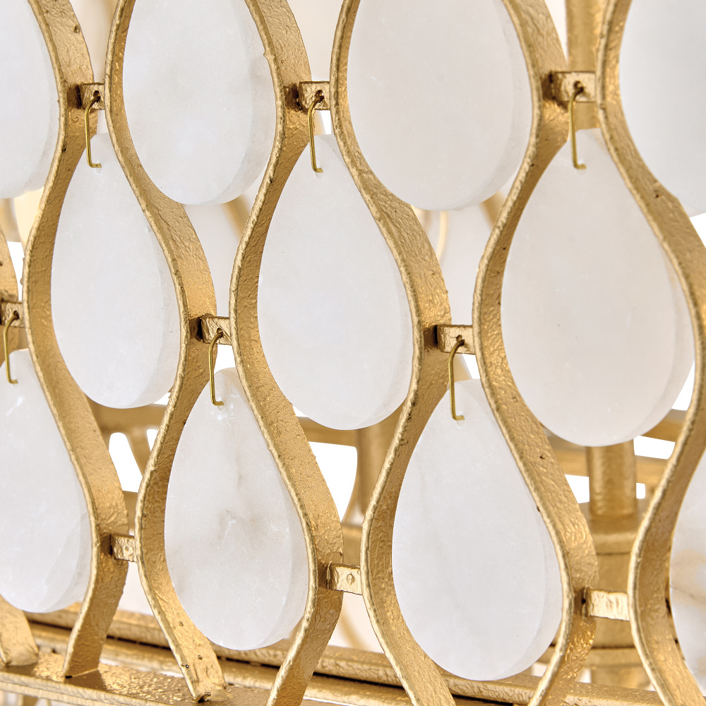 Opulently adorned with natural alabaster stones held within a traditional latticework shade, Estie brings organic elegance to any decor aesthetic. Intricately curved metalwork complements the frame, chain, and canopy in a textured, hand-painted Piastra Gold finish