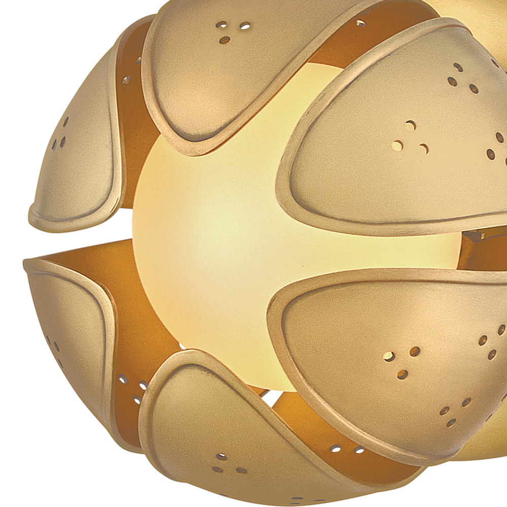 A work of luminary art, Anthos elevates its floral-inspired form with alluring illumination. Raised edge details and distinct perforations accentuate each blossom crafted from solid unlacquered brass petals. Radiant LED lamps enveloped by blown etched opal glass transform the surrounding space with a captivating interplay of light and shadow.