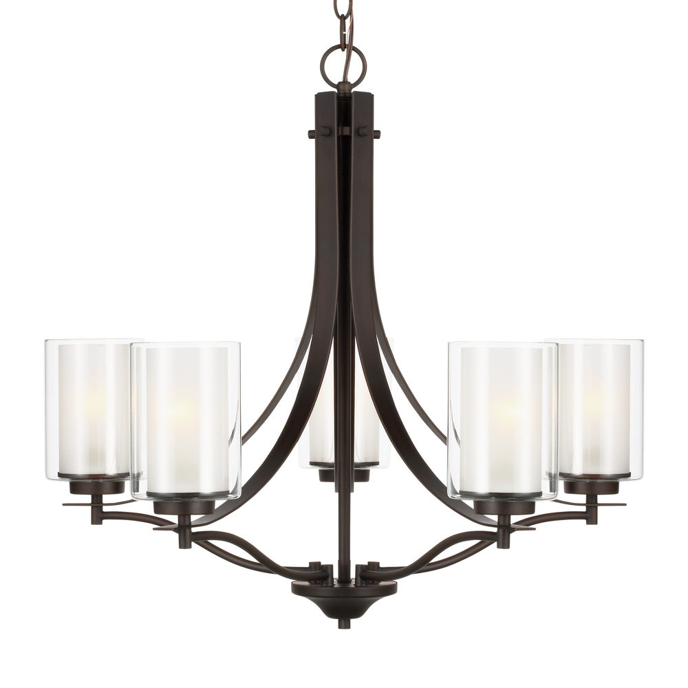 The Elmwood Park five light single tier chandelier in bronze enhances the beauty of your home with ample light and style to match today's trends. Elmwood Park by has clear glass tube shades with an inner white glass element that softens the light and helps cast an even glow. A cylinder of etched glass is centered within a larger cylinder of clear glass which encircles each light bulb to create this stunning visual effect. The full assortment includes three-, five-and nine-light chandeliers, a four-light linear, one-light mini pendant, a three-light pendant, a two-light semi flush which is convertible into a pendant, and one-, two-, three- and four-light bath fixtures. All fixtures offered in either a Brushed Nickel or Brushed Oil Rubbed Bronze. Incandescent and ENERGY STAR-qualified LED lamping are available; all fixtures are California Title 24 compliant.