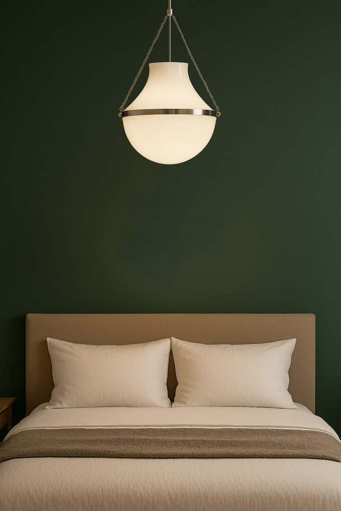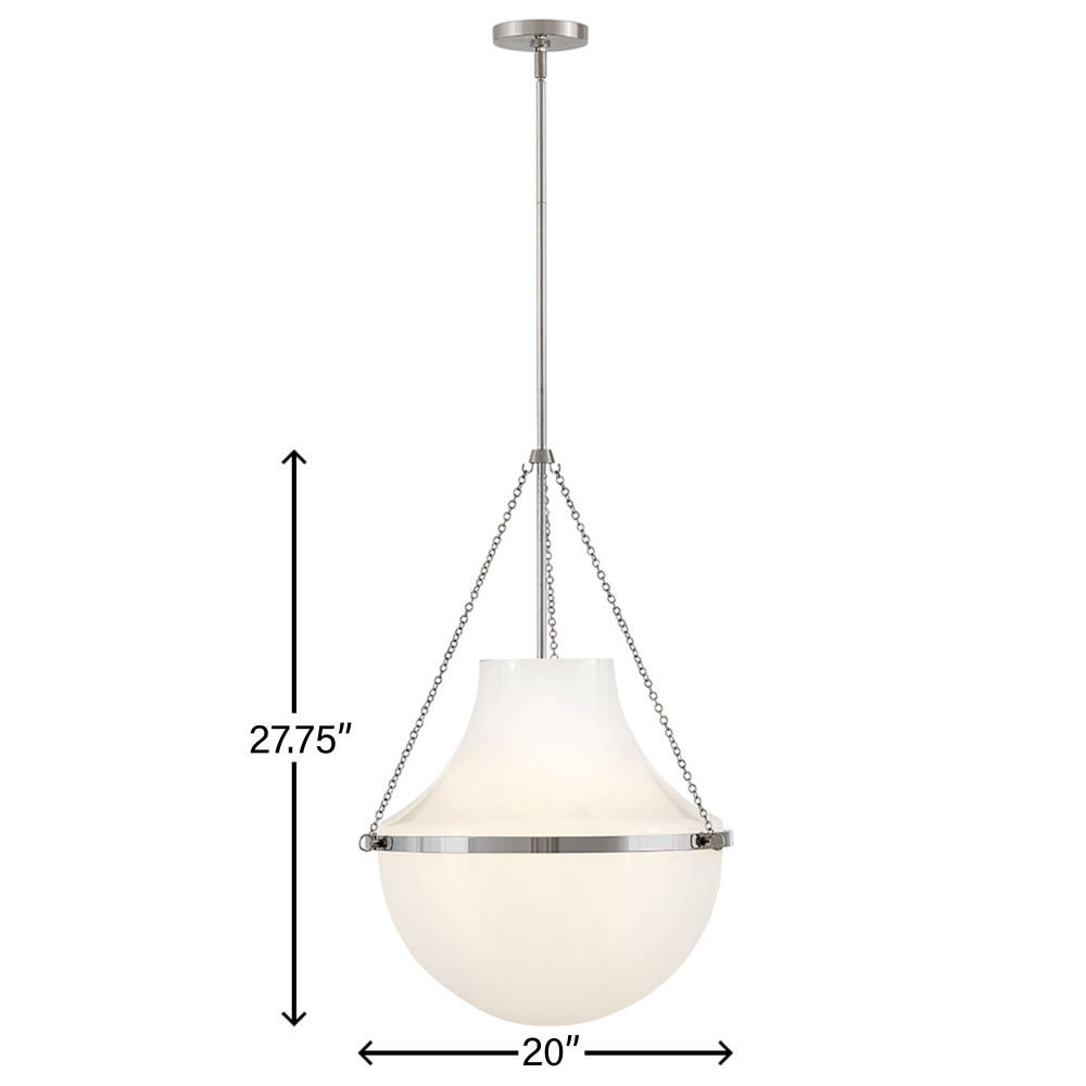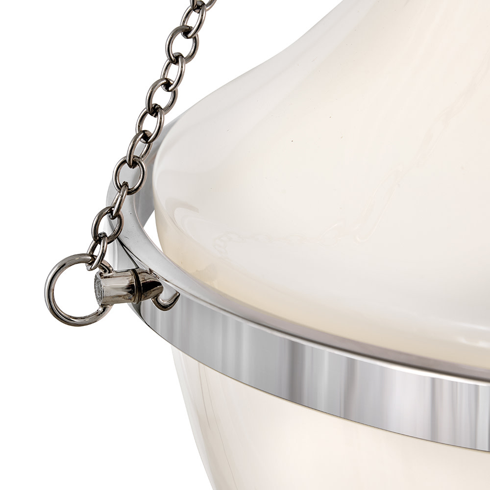 Fusing a sculpted, modern form with classically styled details, Collins features a transitional teardrop shade crafted from blown, cased opal glass. A central metal band and delicate chain uprights are available in Heritage Brass or Black Oxide finishes.