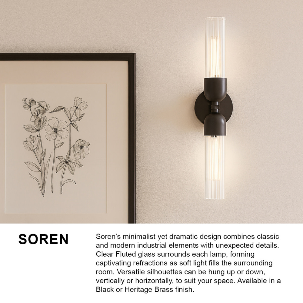 Soren’s minimalist yet dramatic design combines classic and modern industrial elements with unexpected details. Clear Fluted glass surrounds each lamp, forming captivating refractions as soft light fills the surrounding room. Versatile silhouettes can be hung up or down, vertically or horizontally, to suit your space. Available in a Black or Heritage Brass finish.