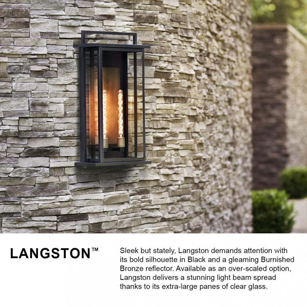 Sleek but stately, Langston demands attention with its bold silhouette in Black and a gleaming Burnished Bronze reflector. Available as an over-scaled option, Langston delivers a stunning light beam spread thanks to its extra-large panes of clear glass.