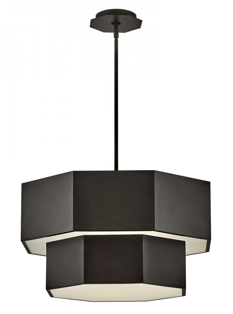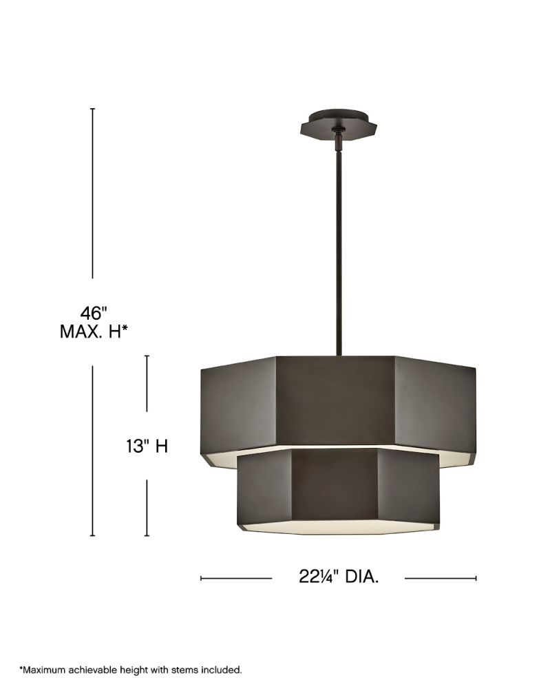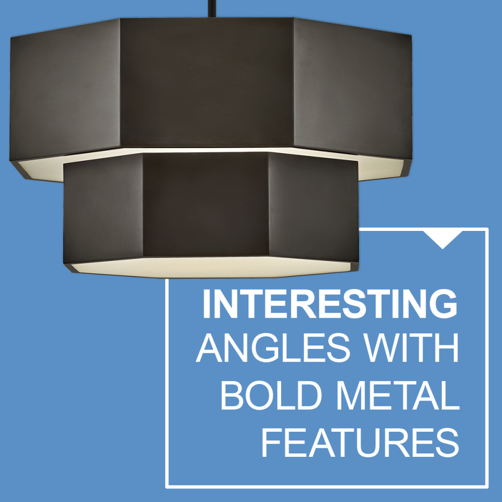 View the many sides of Facet. Interesting angles combine with bold metal features to create an edgy and contemporary profile that is unpretentious yet unforgettable. Hexagonal etched glass is showcased by Heritage Brass or Black Oxide finishes.