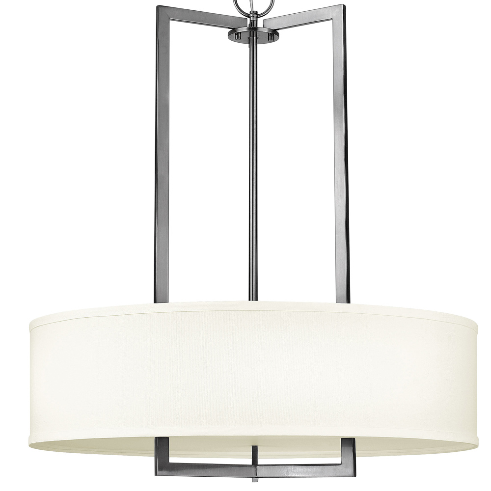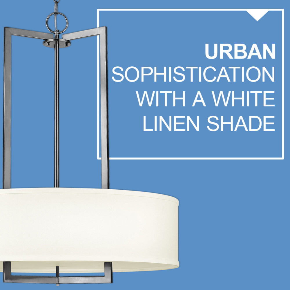 Hampton is a modern transitional design, offering the ultimate in urban sophistication. The minimal, rectangular frame is softened by a contemporary off-white linen drum shade.