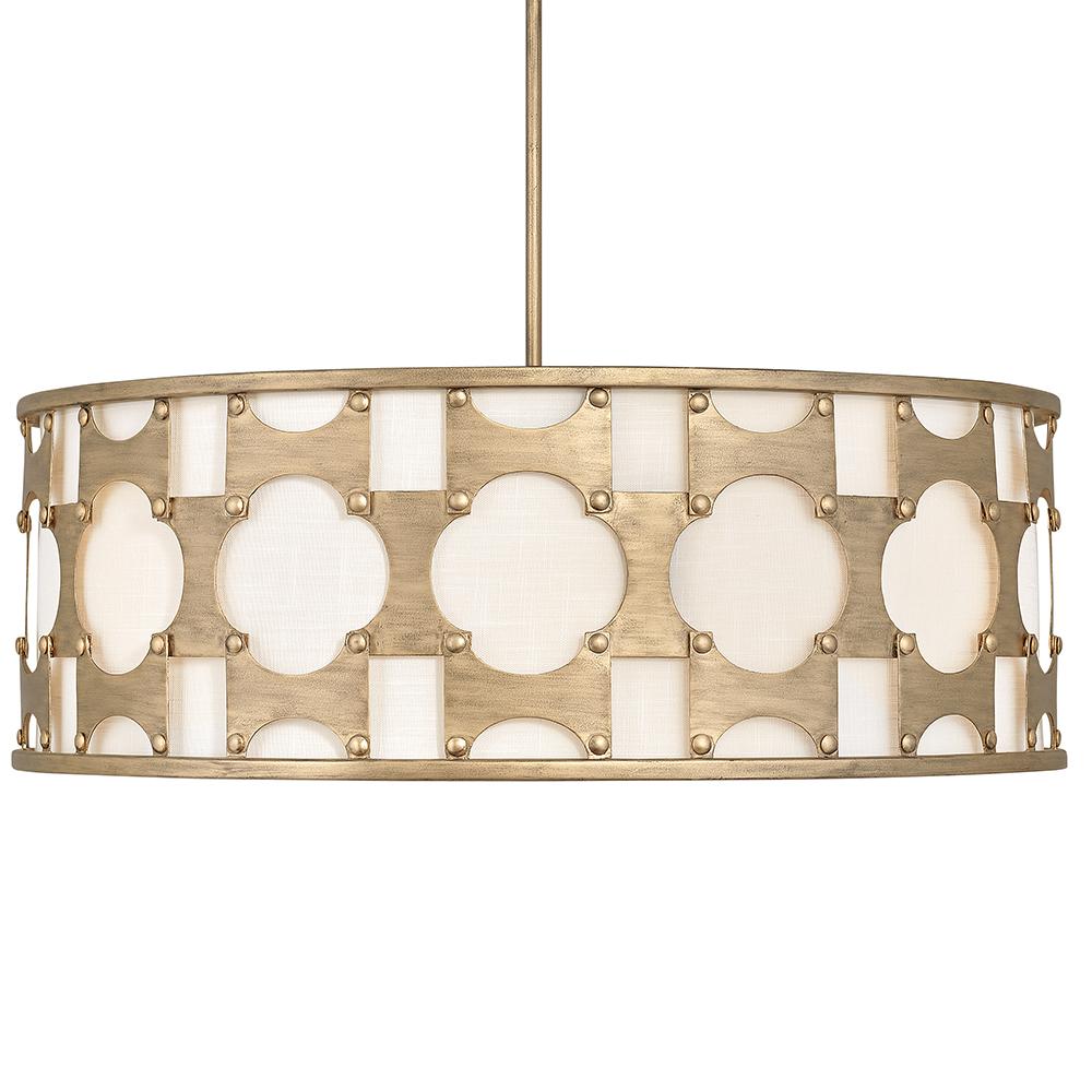 Carter is a traditional drum silhouette with details galore. An intricate, hand-riveted pattern in Burnished Gold encompasses the off-white textured fabric shade. A decorative candle cluster bursts within to further enhance this dynamic design.