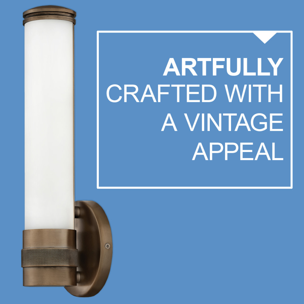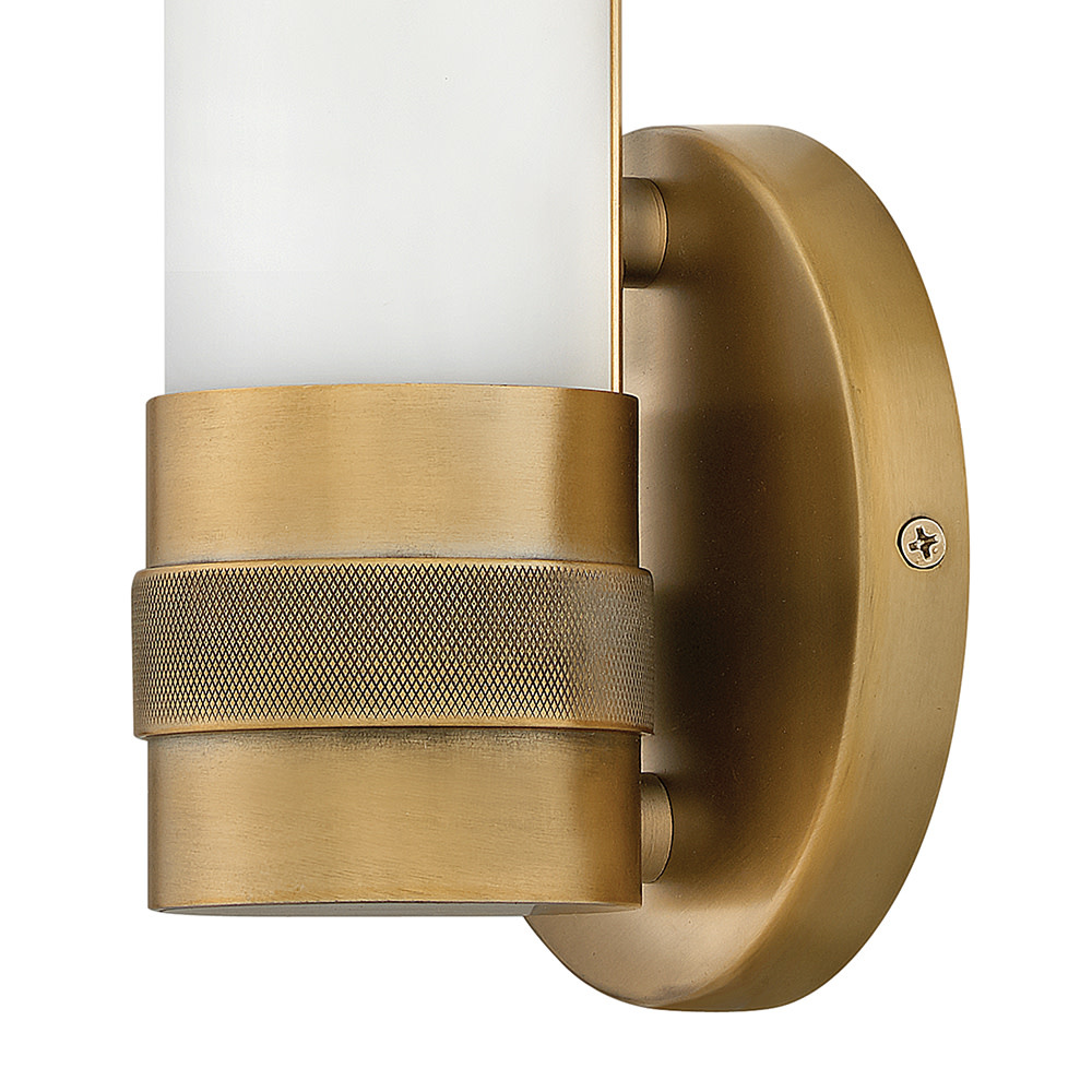 Remi's slim profile and sophisticated details seamlessly merge with LED technology to master both form and function. The etched white glass cylinder is finely detailed with precise, stepped end caps, and the cast knurled bracelet in luxe finish options is artfully crafted with vintage appeal. This chic, transitional design ensures Remi's ability to complement a wide variety of bath or interior spaces.