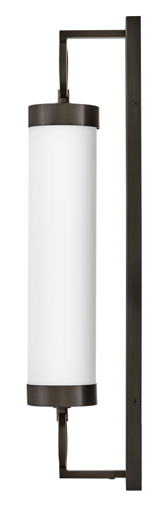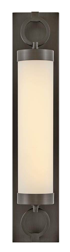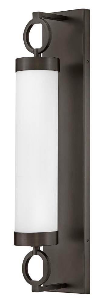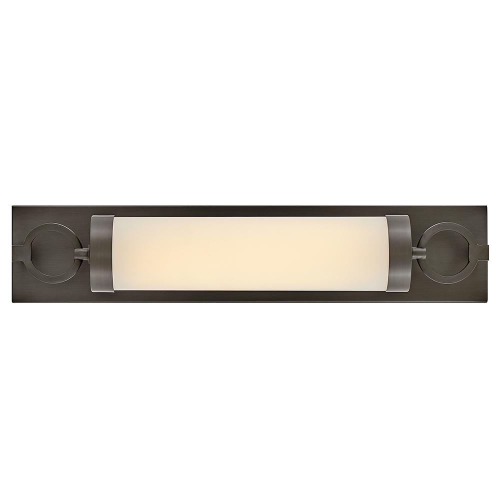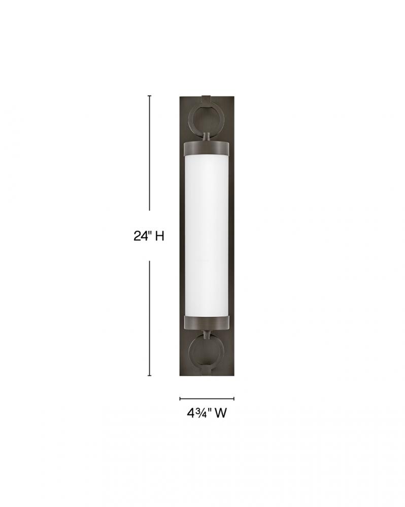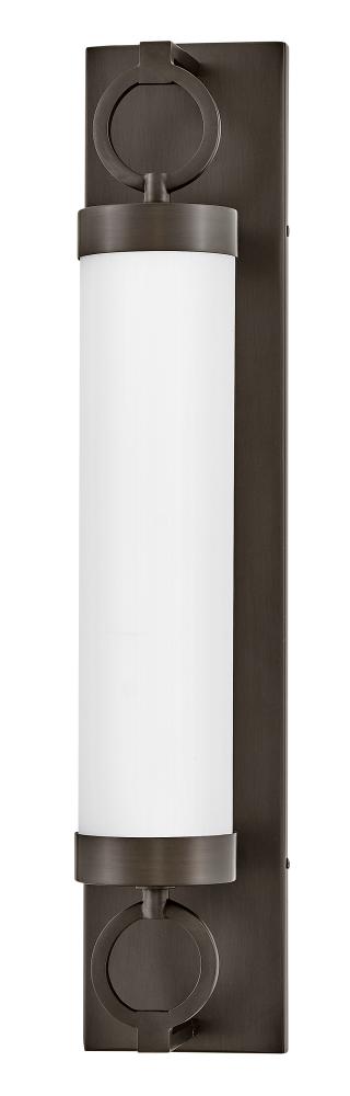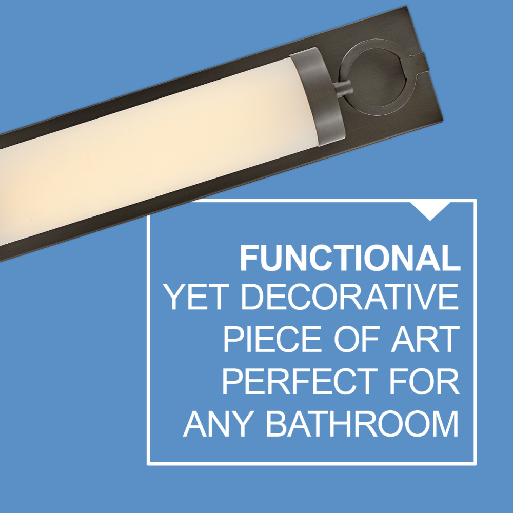 For a fixture that is an industrial piece of art, look to Baylor. The sturdy back plate and decorative rings add a nice balance to the etched opal glass to finish off the strong, substantial look. Ideal for providing plenty of functional light, Baylor mounts cleanly to the wall vertically or horizontally to bring style to primary bath, powder rooms, and more. Baylor is part of the Lisa McDennon Collection.