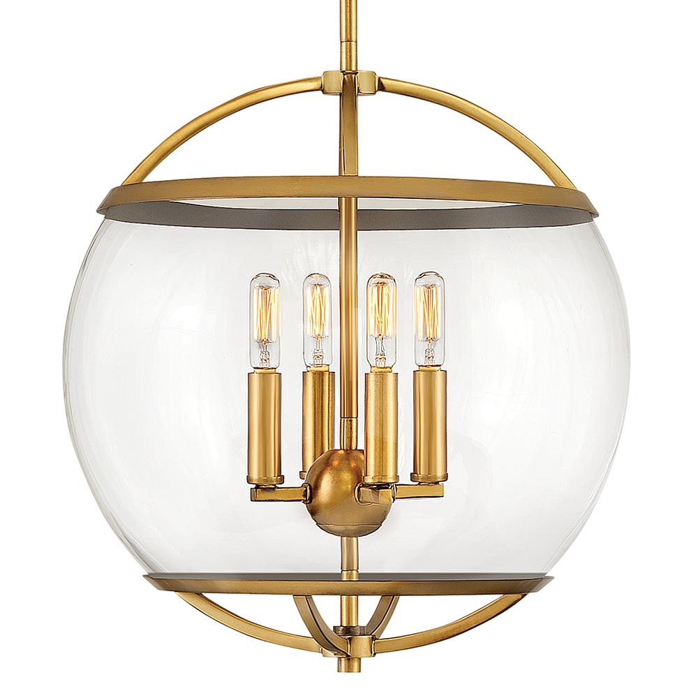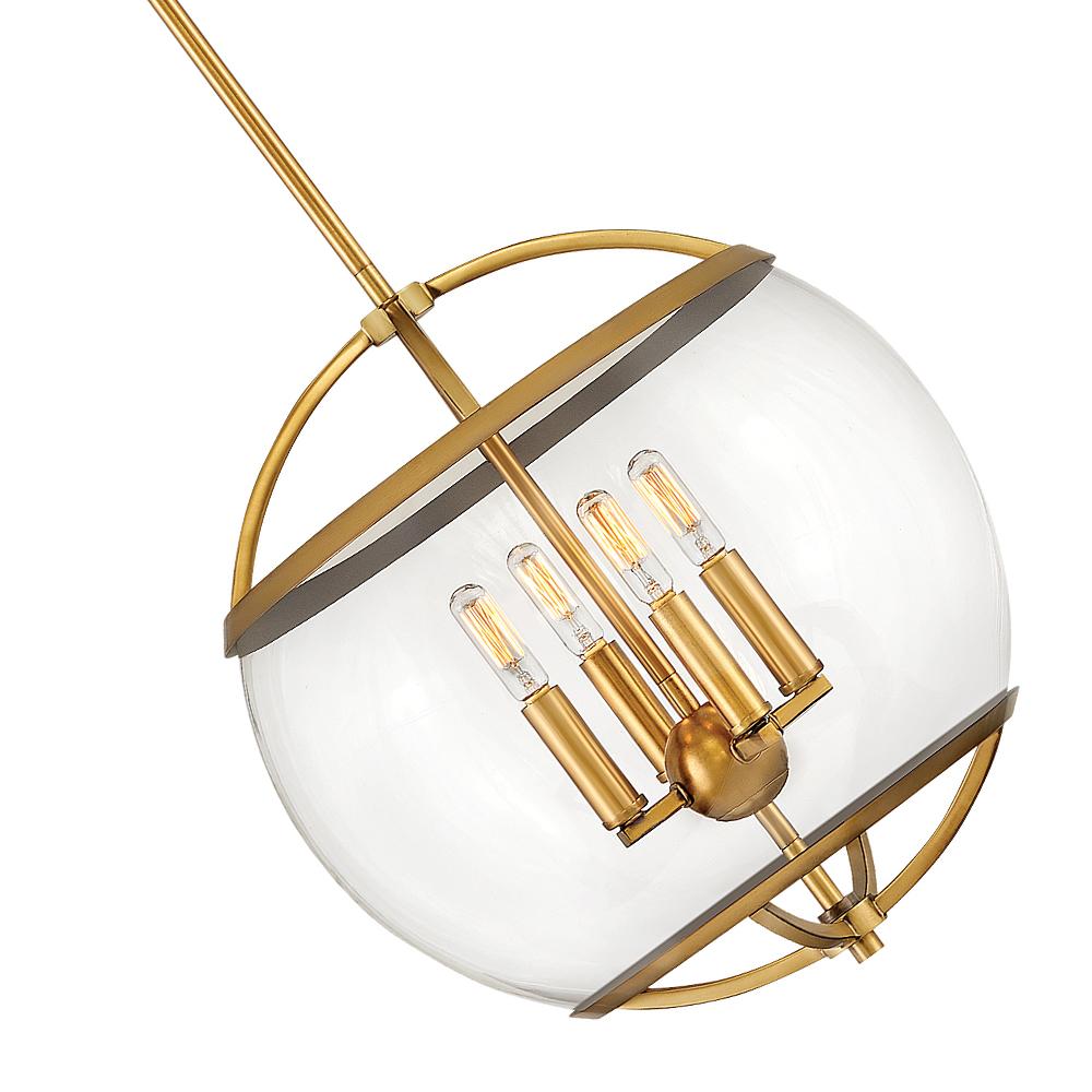 The wide glass band featured in Calvin clearly has global appeal, but the sphere of influence does not stop there. The orb is completed by the rounded, open cage on top and bottom to add style and stability. This mid-century modern silhouette in Heritage Brass or Black with Heritage Brass finish encloses a classic candle cluster.