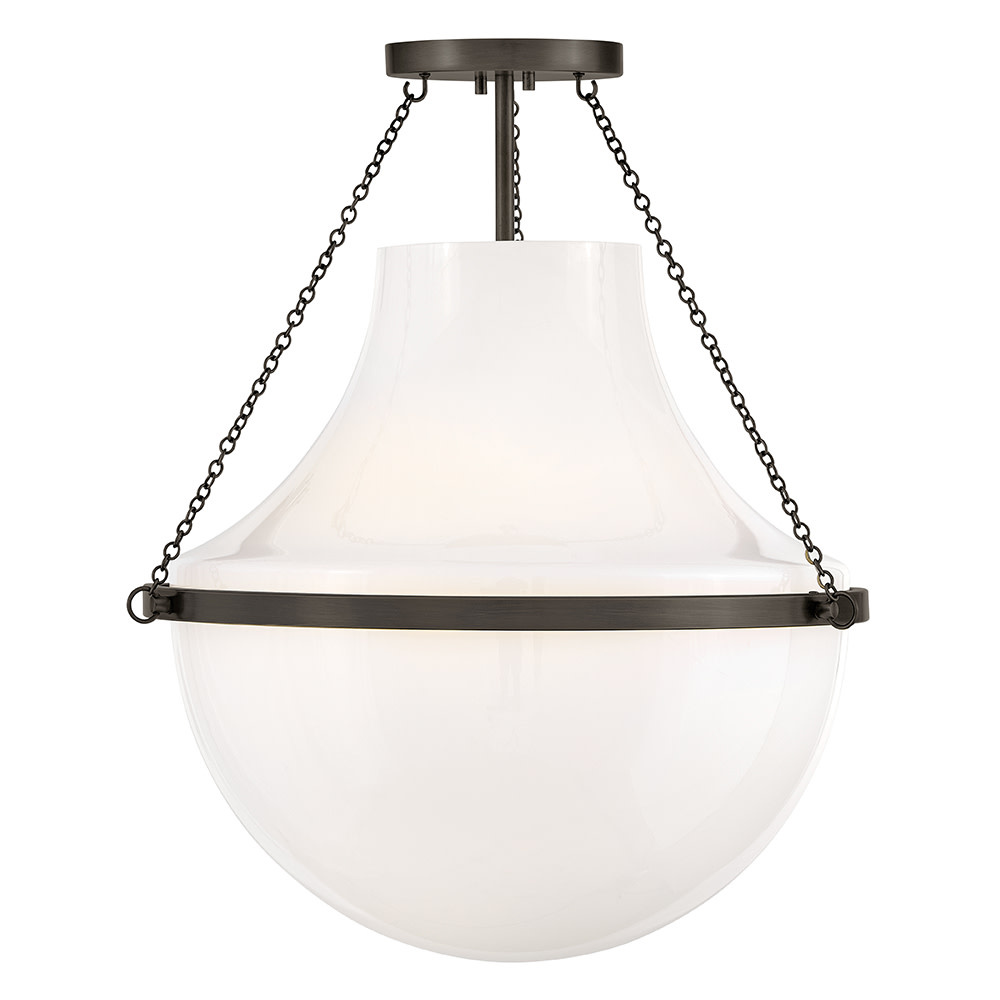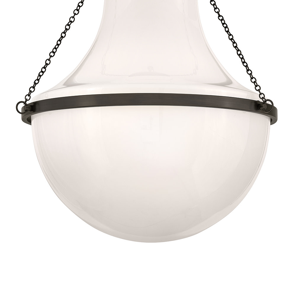 Fusing a sculpted, modern form with classically styled details, Collins features a transitional teardrop shade crafted from blown, cased opal glass. A central metal band and delicate chain uprights are available in Heritage Brass or Black Oxide finishes.