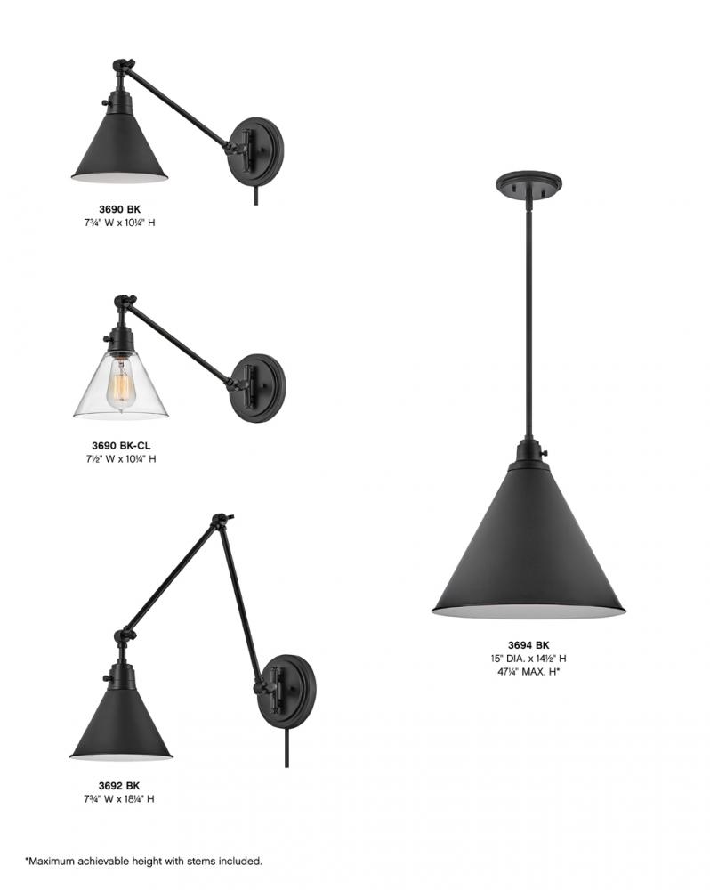20.5 Extension, Dimensions as shown, Fully adjustable, On/Off switch, Optional Cord Cover BK