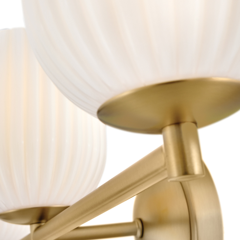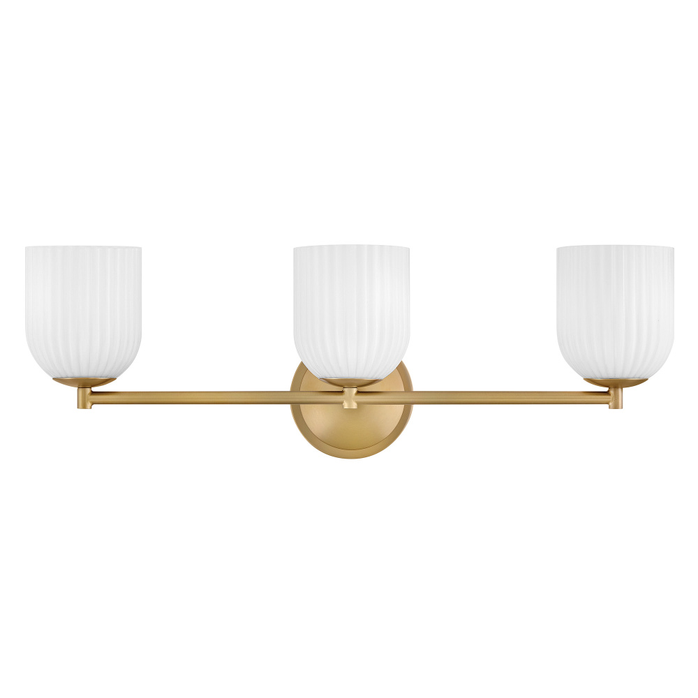 The graceful curves of Ava’s transitional ribbed glass shades are balanced by a sleek silhouette and stepped backplate. A hand-painted Lacquered Brass finish complements the Clear or Cased Opal glass with warm metallic tones, creating a timeless look that complements any decor style.