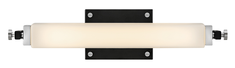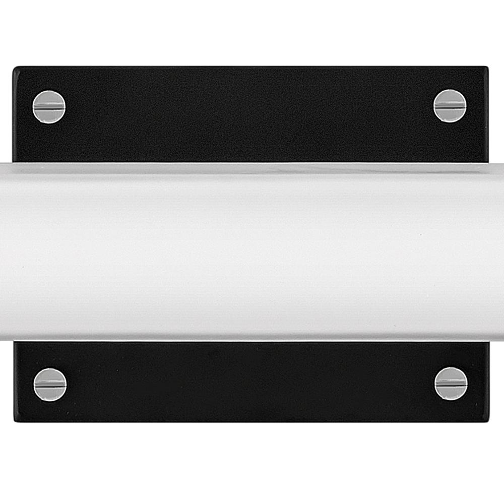Rollins is both industrial in form and transitional in style. Unique rectangular etched opal glass has softly rounded edges offset by contrasting details on the backplate and the square knobs anchoring either end. This integrated LED design comes in two finish combinations, Black with Chrome and Black with Heritage Brass, and can be hung both vertically and horizontally.