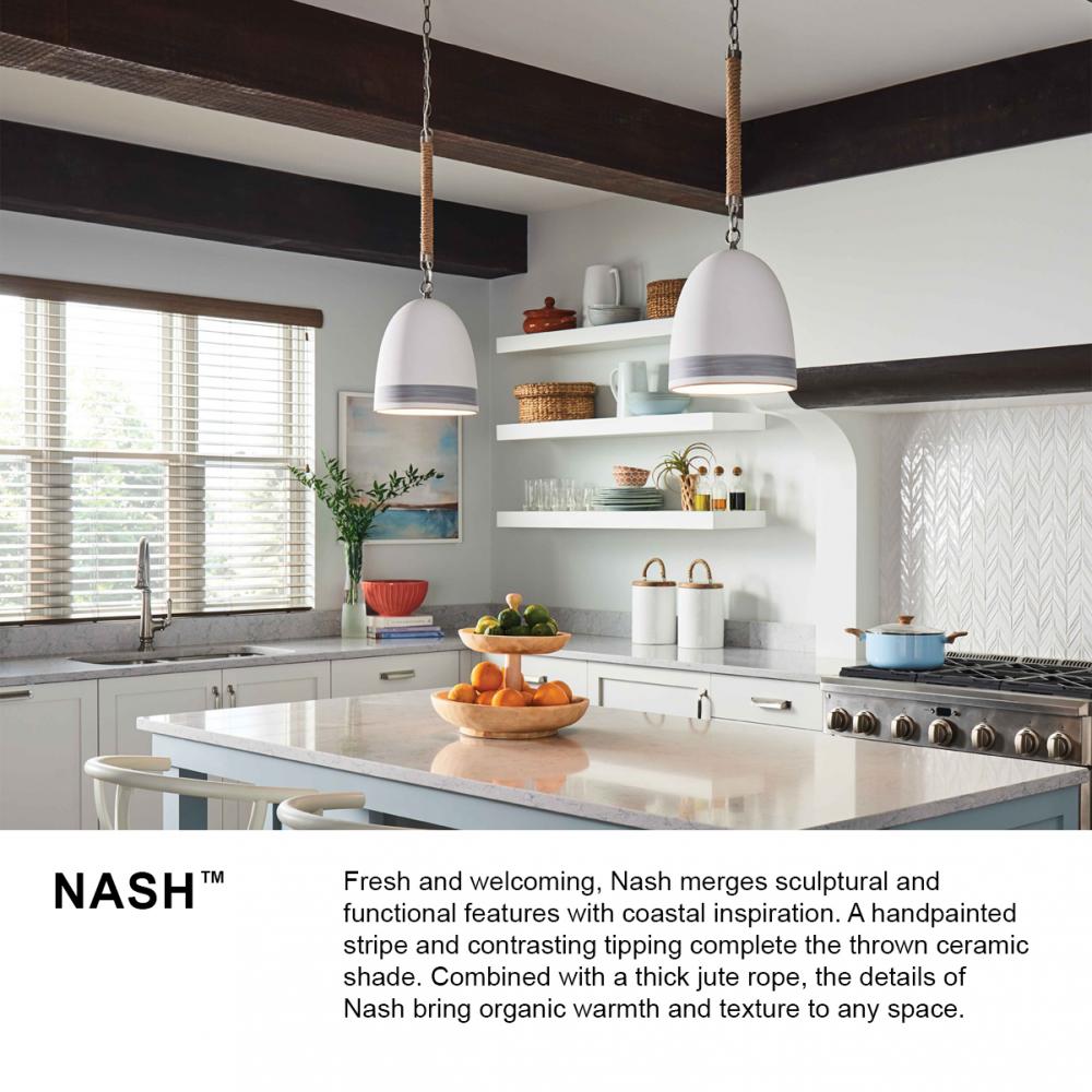 Fresh and welcoming, Nash merges sculptural and functional features with coastal inspiration. A hand-painted stripe and contrasting tipping complete the thrown ceramic shade. Combined with a thick jute rope, the details of Nash bring organic warmth and texture to any space.