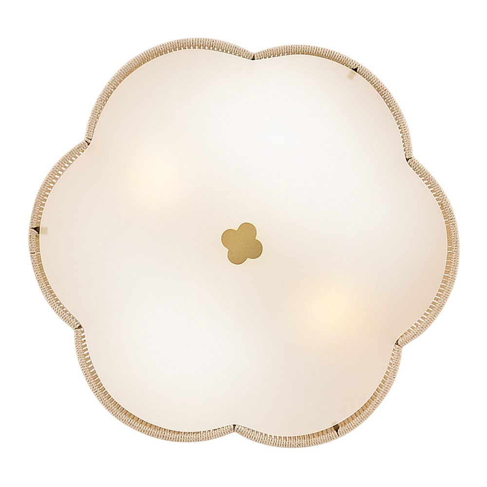 A chic yet casual decor statement infused with natural texture, Sasha’s subtly tapered, scalloped shade is hand-wrapped in natural-fiber cord, imparting an unexpected element of sheer softness to your decor. A clover-shaped Etched glass diffuser glows with welcoming illumination, secured by a complementing clover finial and a frame finished in Lacquered Brass.