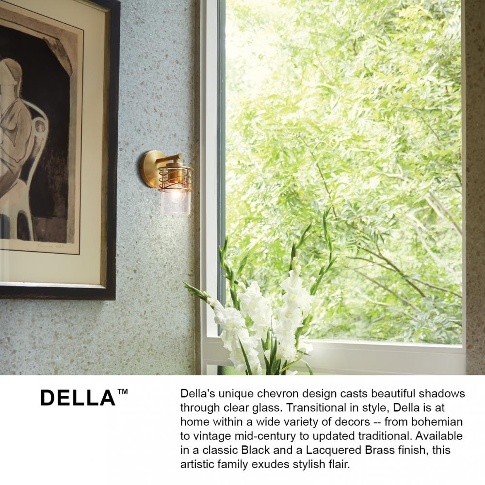 Della’s unique chevron design casts beautiful shadows through clear glass. Transitional in style, Della is at home within a wide variety of décors - from bohemian to vintage mid-century to updated traditional. Available in a classic Black or a Lacquered Brass finish, this artistic family exudes stylish flair.