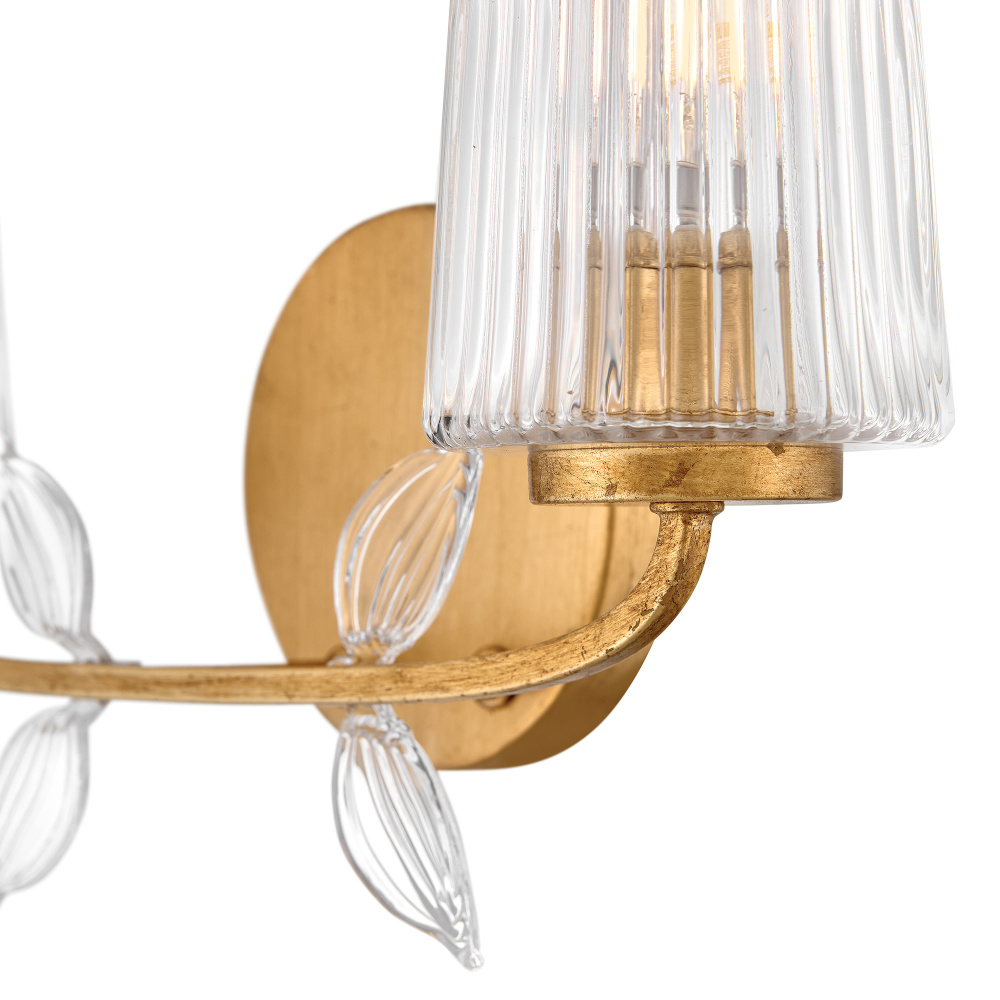 Feminine and romantic, Aliso’s thin, delicate frame is adorned with dainty, clear, pressed glass leaves. A hand-painted Distressed Brass finish enhanced by gold leaf makes a polished and luxurious statement in both traditional and modern settings