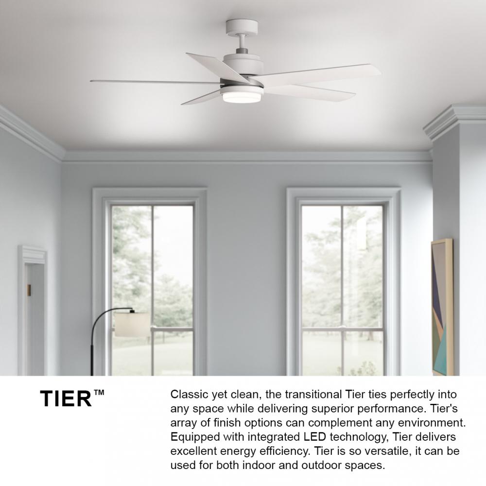 Classic yet clean, the transitional Tier ties perfectly into any space while delivering superior performance. Tier's array of finish options, including Appliance White, Brushed Nickel, Matte Black and Metallic Matte Bronze, can complement any environment. Equipped with integrated LED lighting technology, Tier delivers excellent energy efficiency. Tier is so versatile; it can be used for both indoor and outdoor spaces. Blades are included with every fan.