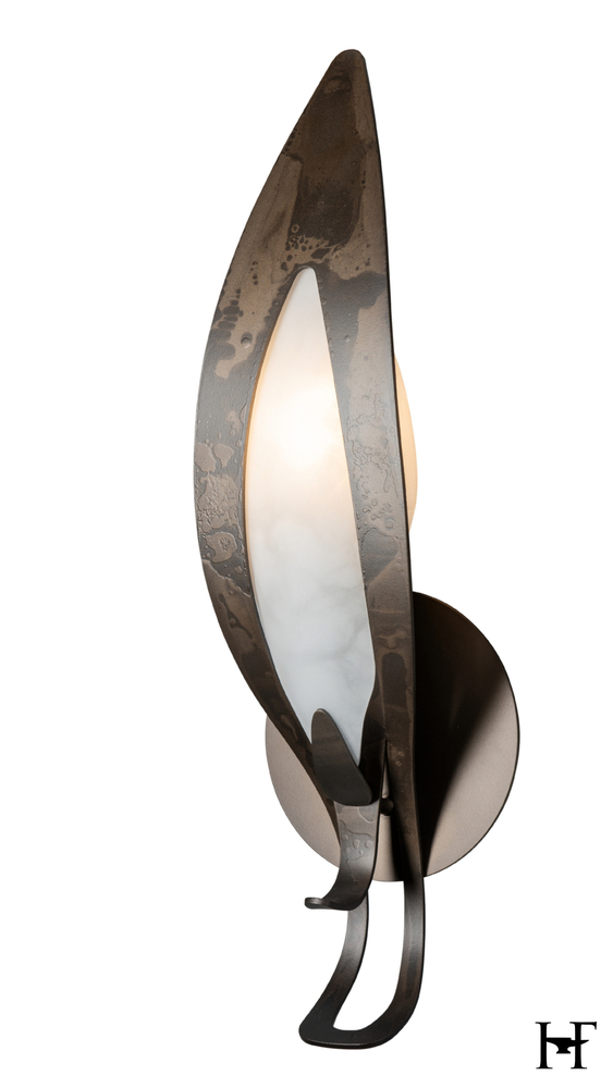 Hand-forged and beautifully shaped by Vermont artisans, the Parasol displays the work of our makers through the texture and personality that steel only achieves in the fires of the forge at more than 1800ºF. A piece of white art glass is nestled in the curve of the sconce's upward reach. According to HF designer Jason Hancock, a "milky" candelabra bulb is an ideal choice.