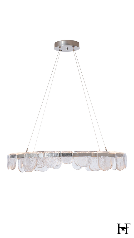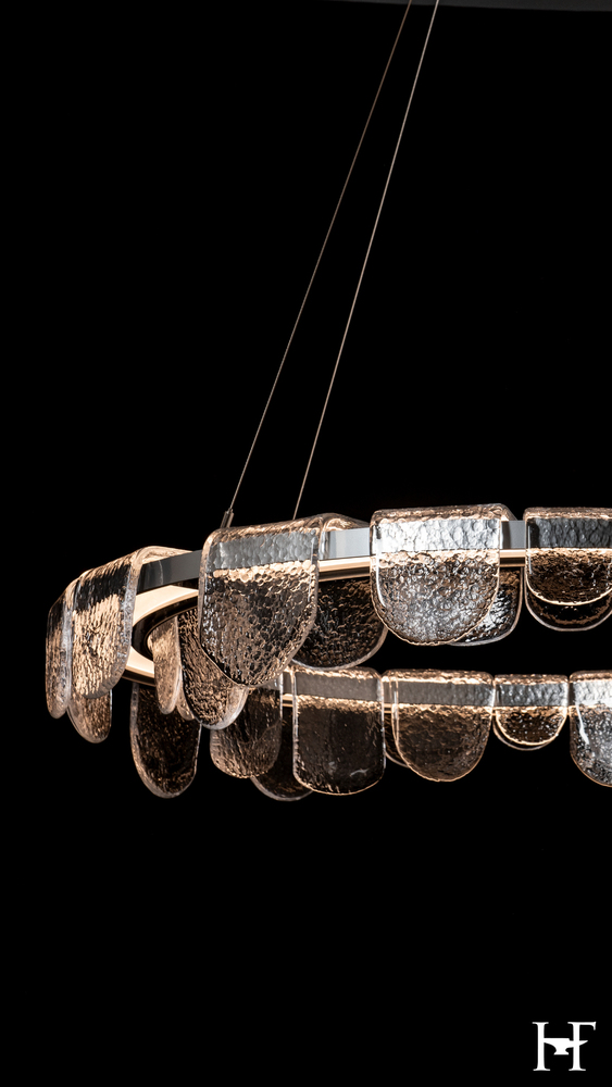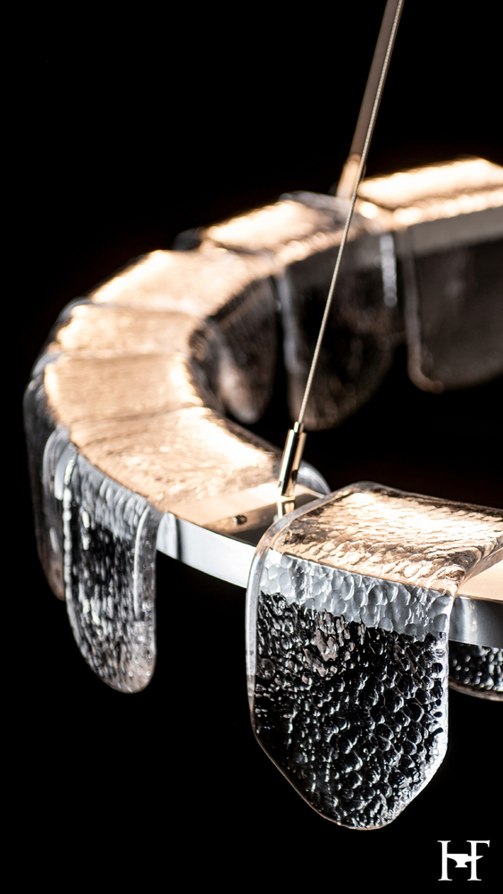 A riverbed of light. Stunning heavily-textured, clear poured artisanal glass in varying sizes are formed and shaped, then positioned on a round LED light-guide platform to stunning visual effect. Inspired by the cold icy streams of Vermont, adorned with ice-covered rocks and boulders, designer Andy Morter envisioned the Riverbed Collection to be like the frozen stones set along the river’s edge.