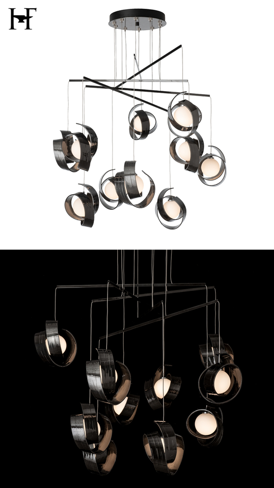 Each Riza curl is hammered and shaped to create this stunning display. The mobile platform minimizes the canopy, while the delicate metal tubes guide the cables providing not just great breadth, but also a highly-adjustable fixture. Riza elements are artfully balanced for a unique feeling of both depth and whimsy.