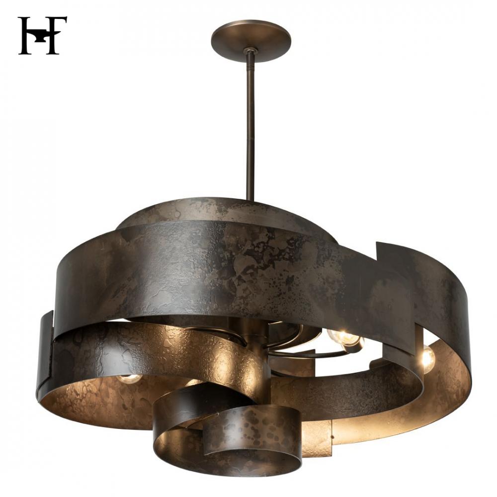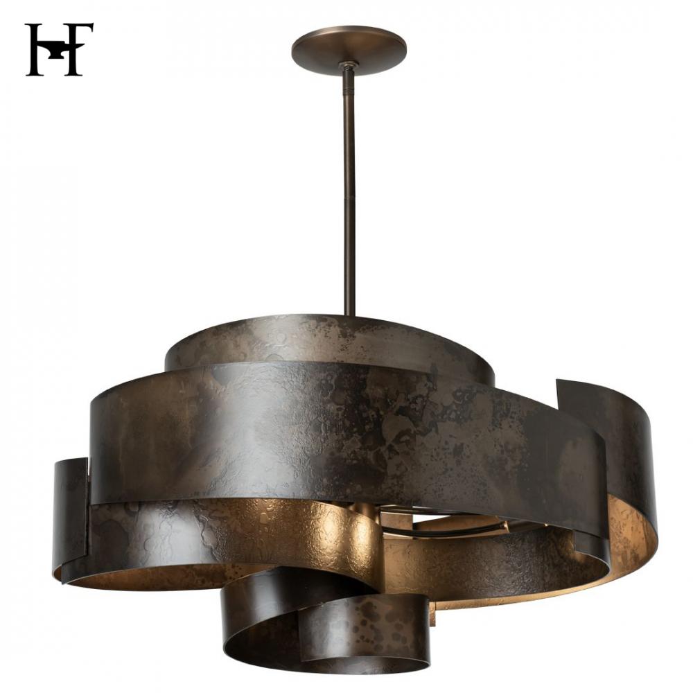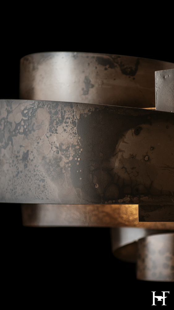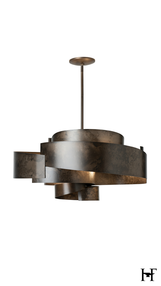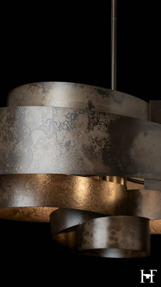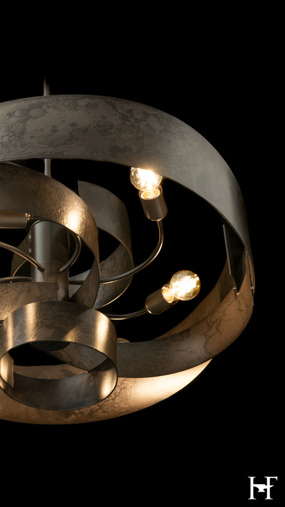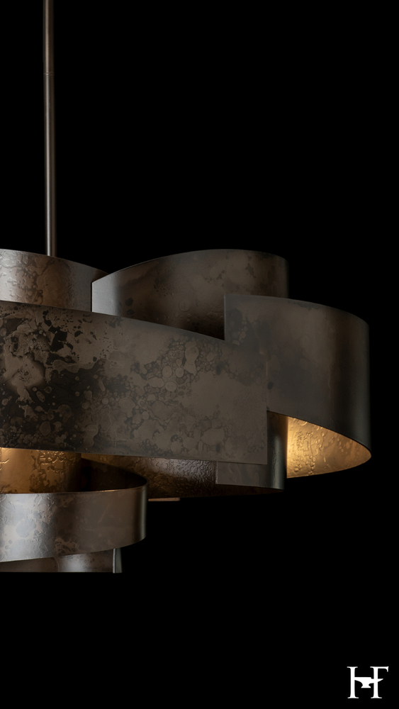Like the ancient flow of a silk sleeve to block the sword of an aggressor, the movement and flow of the Zen Pendant's wide steel swirl is mesmerizing. The hand-forged and textured steel glows from the lights within, allowing them to play across the hand-shaped metal's interior surface. The work of Vermont artisans is palpable in this stunning and substantial piece.