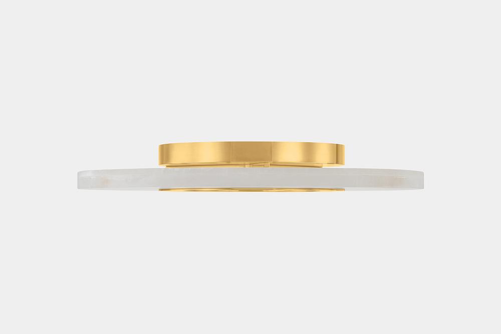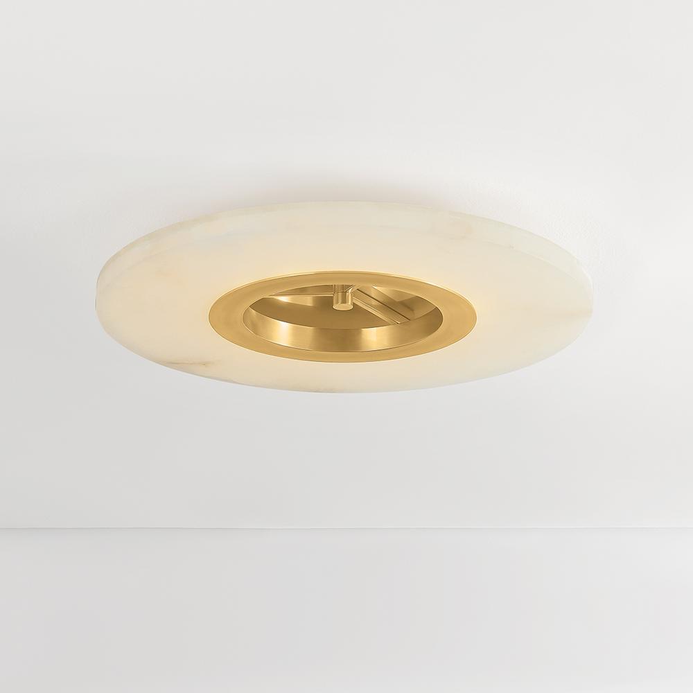 The Alto flush mount serves as a striking sculptural piece on the ceiling. When illuminated, the natural alabaster comes alive with intricate veining, creating an upscale, yet minimalist lighting effect. While the fixture feels fresh, the Aged Brass frame lends Alto an antique feel. Due to the one-of-a-kind nature of the medium, exact colors and patterns may vary slightly from the image shown.